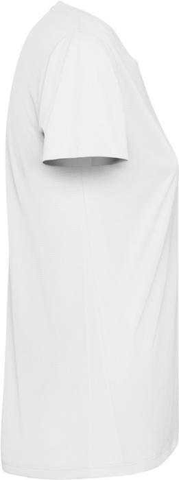 Moteriški techniniai marškinėliai trumpomis rankovėmis. Apykaklė su derančiomis siūlėmis. Nugaros pakraštys kiek ilgesnis nei priekis. Šoninės siūlės pasislinkusios į priekį.