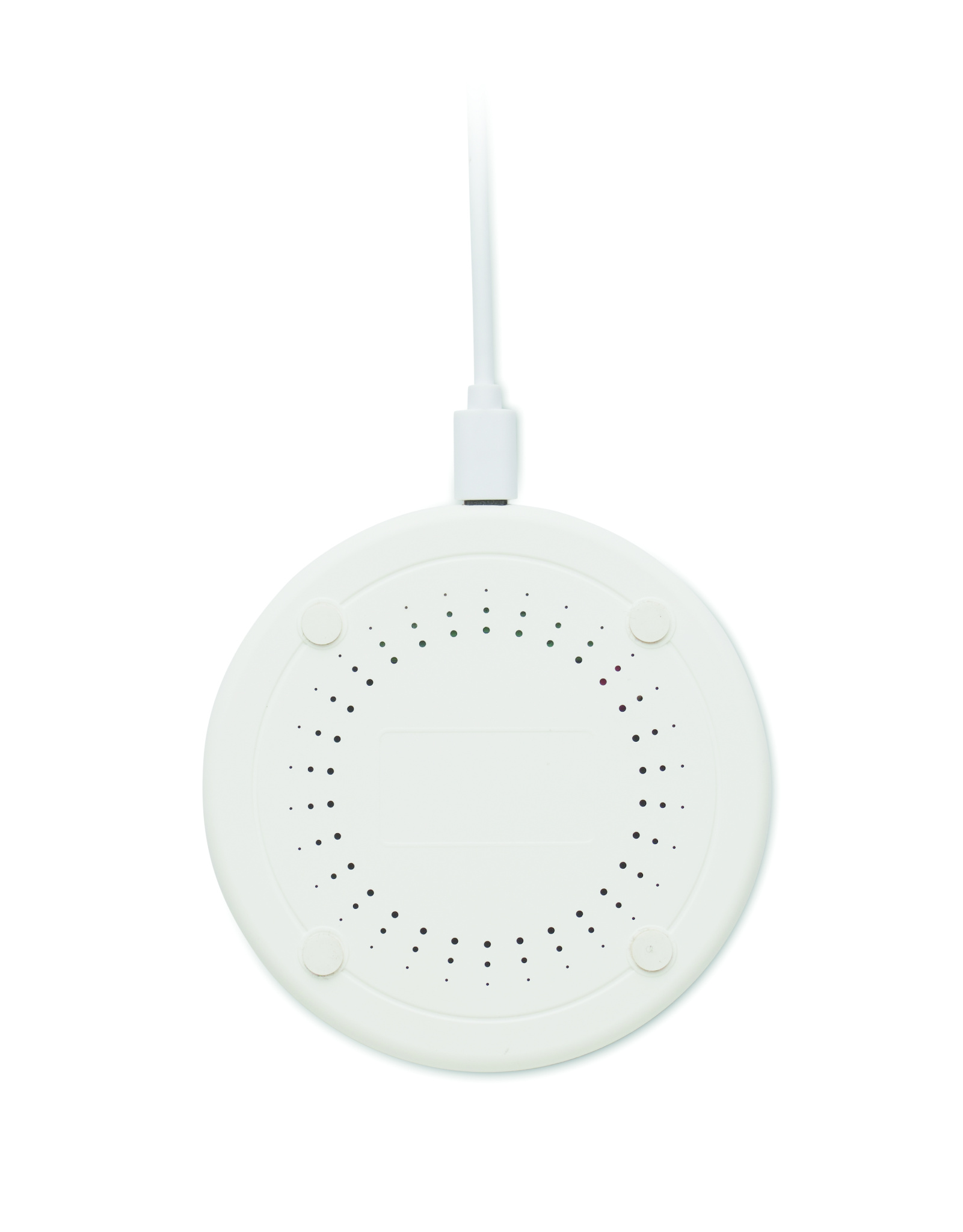 Belaidis įkroviklis iš perdirbto ABS plastiko su medvilnės ir kamštienos detalėmis. Prijunkite prie kompiuterio, padėkite ant jo išmanųjį telefoną ir leiskite jam įsikrauti. Išvestis: nuolatinė srovė 9 V / 1,67 A (15 W).