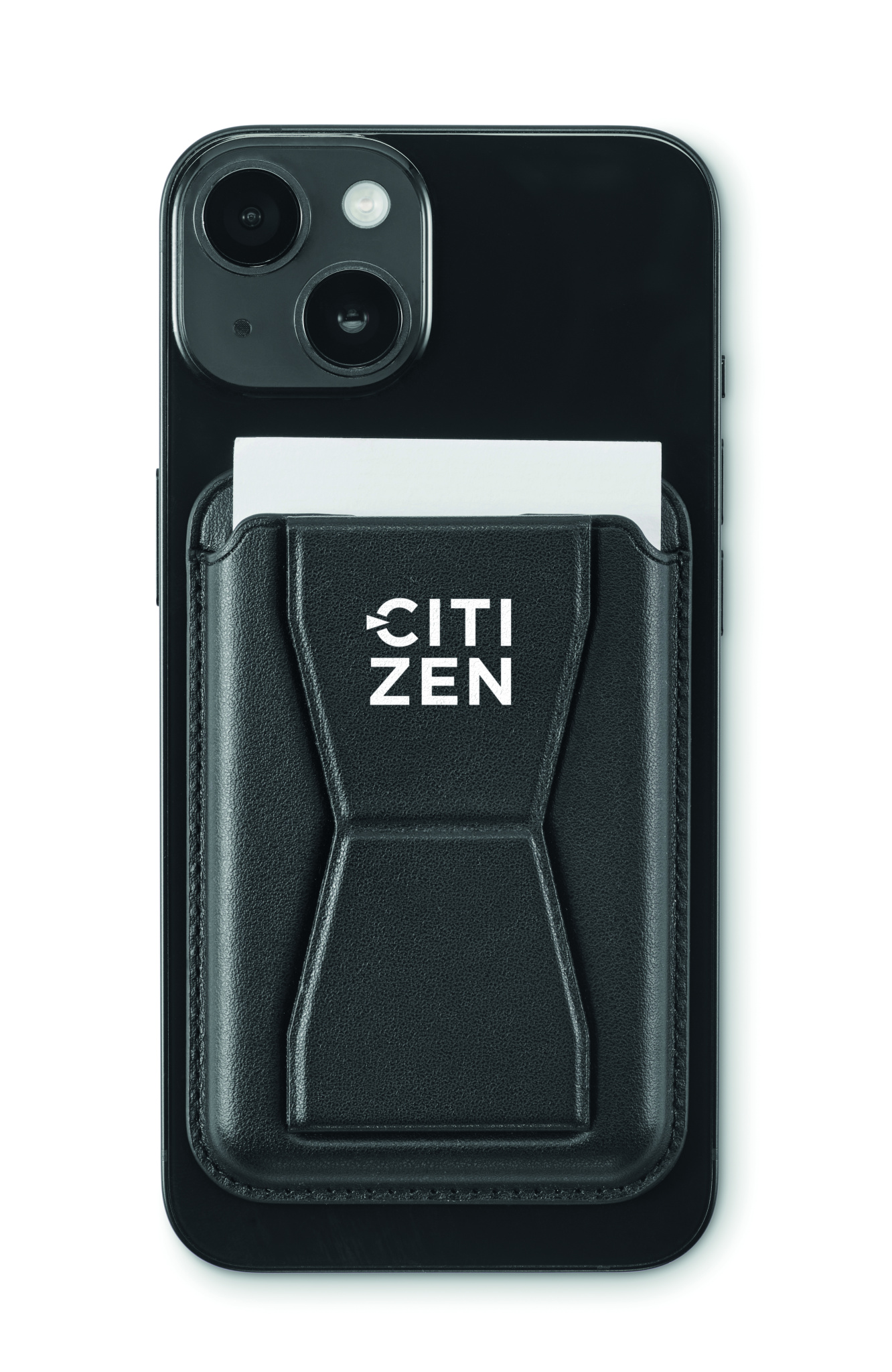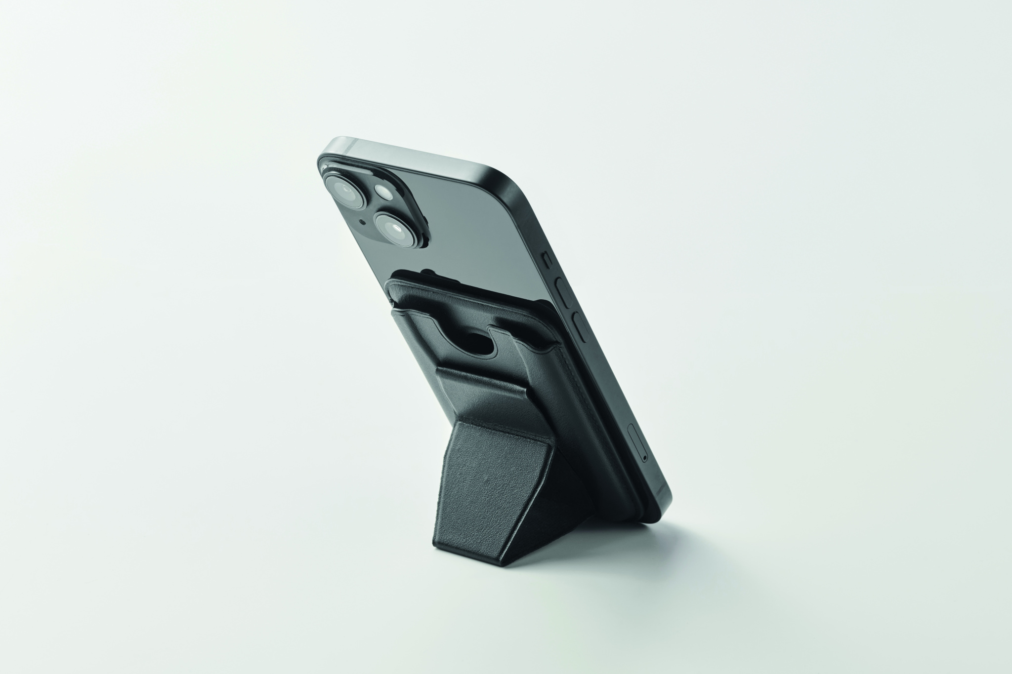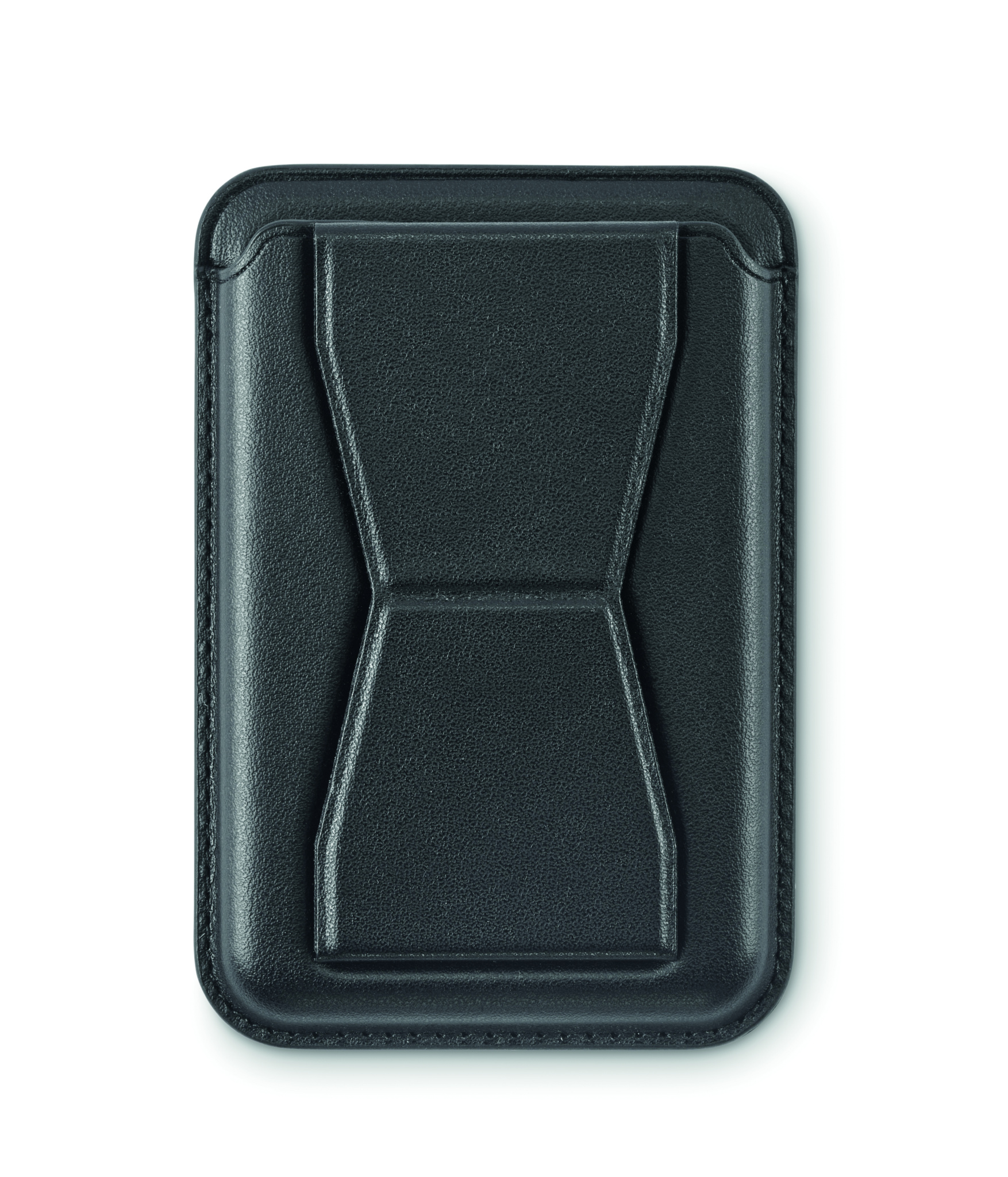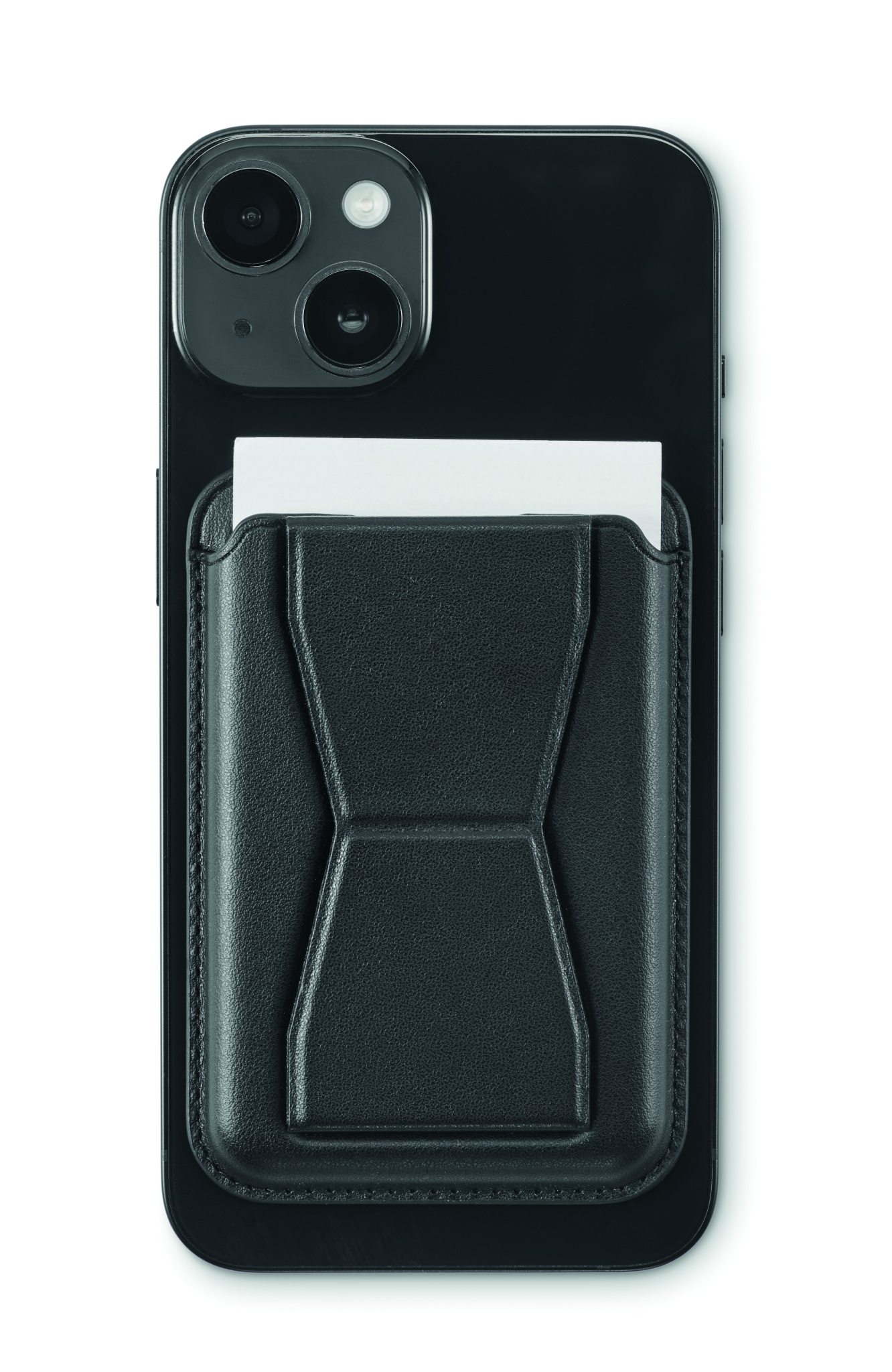 PU odos telefono kortelių dėklas (2 kortelėms) su stovo funkcija ir magnetiniu užsegimu. Suderinamas su „iPhone® 12“ ir naujesniais modeliais. Pridedamas magnetinis metalinis žiedas, skirtas įkrauti kitus nemagnetinius belaidžius įkraunamus telefonus.