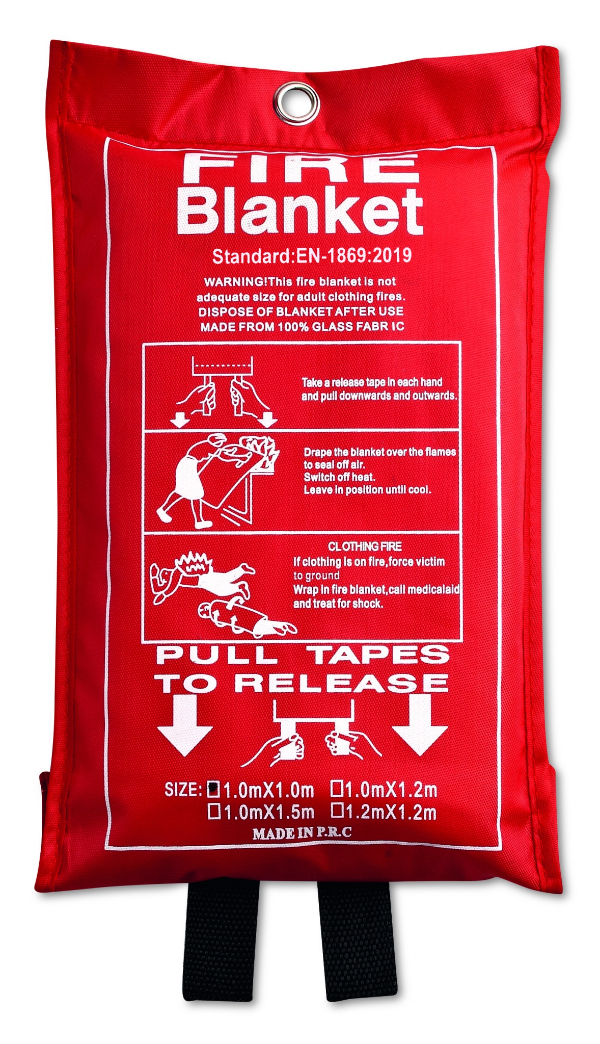 Priešgaisrinė antklodė iš stiklo pluošto, pateikta PVC maišelyje. Antklodės dydis: 95x100 cm.