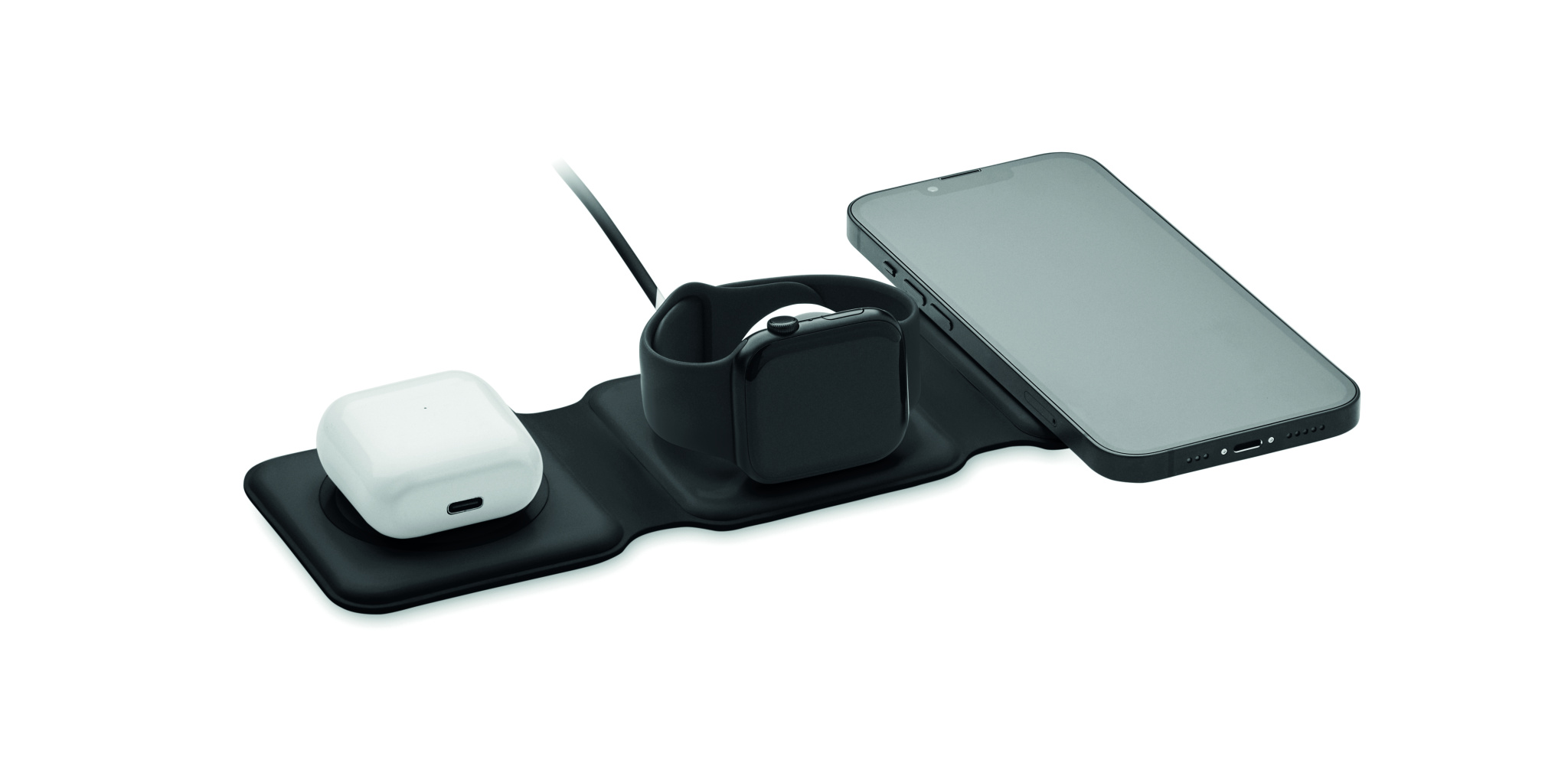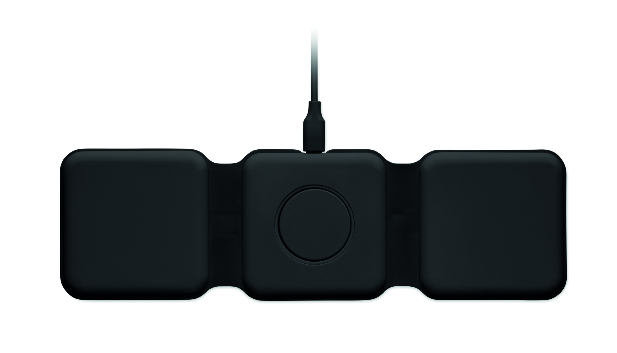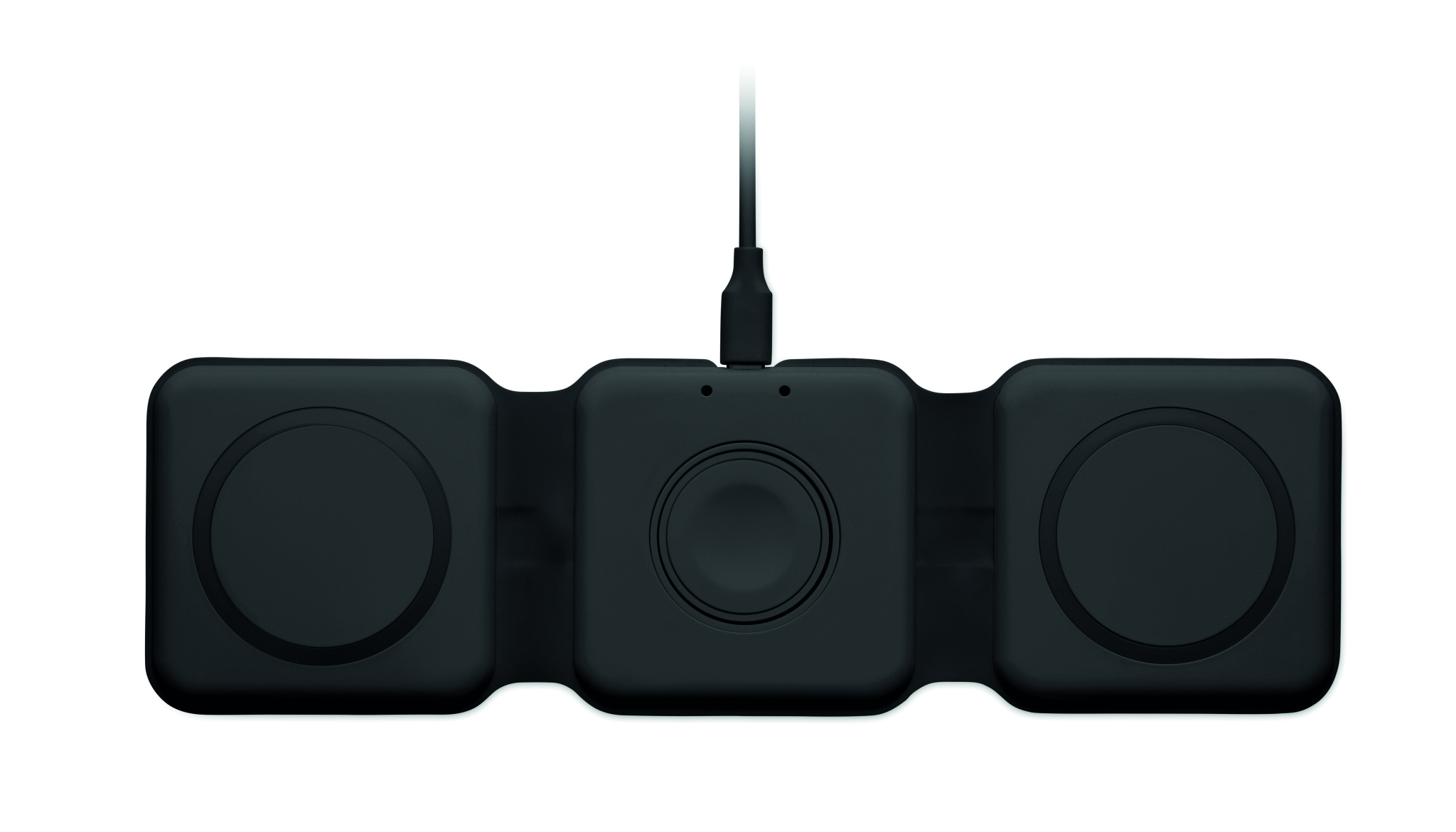 3 viename sulankstoma ABS įkrovimo stotelė. Turi 3 belaidžio įkrovimo taškus (15W). Įvestis: du viename C ir A tipo. Suderinamas su visais QI įrenginiais, pvz., naujausiais Android, iPhone® 8, X ir naujesniais. Taip pat suderinama su iWatch.