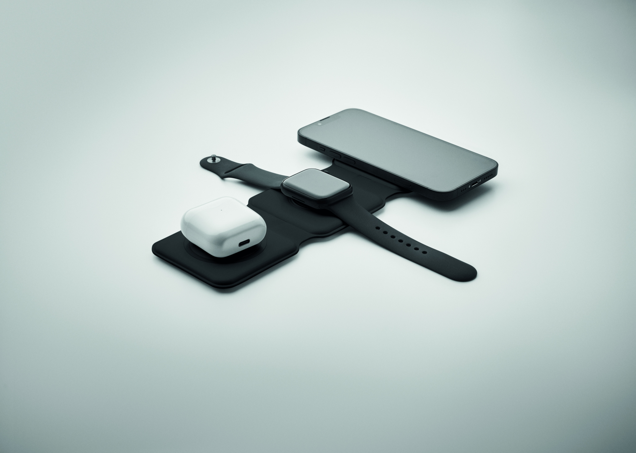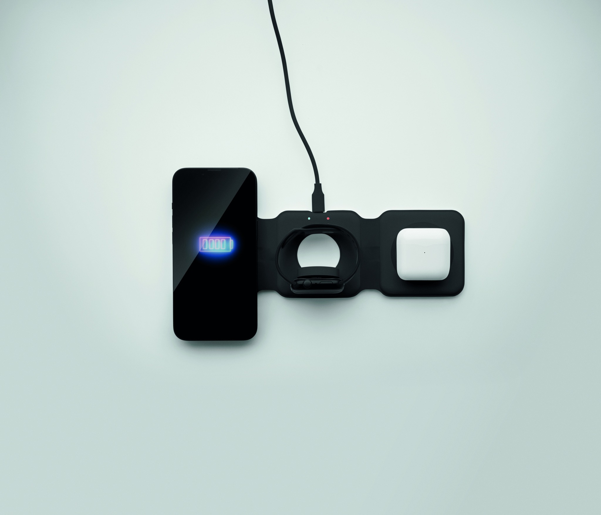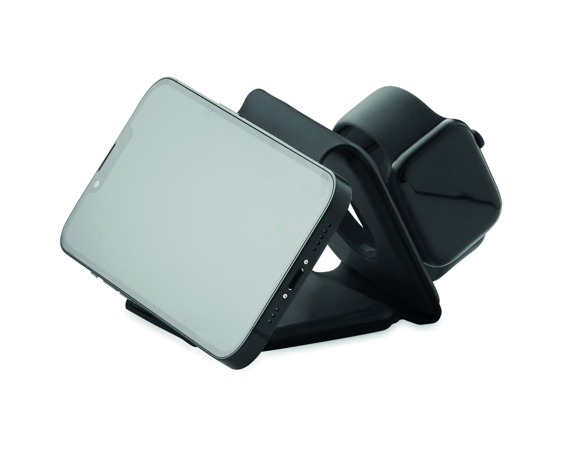 3 viename sulankstoma ABS įkrovimo stotelė. Turi 3 belaidžio įkrovimo taškus (15W). Įvestis: du viename C ir A tipo. Suderinamas su visais QI įrenginiais, pvz., naujausiais Android, iPhone® 8, X ir naujesniais. Taip pat suderinama su iWatch.