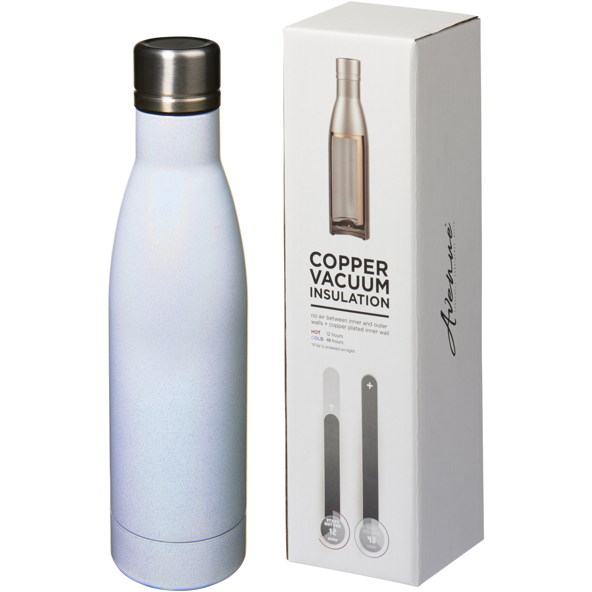 Laikykite savo gėrimus karštus 12 valandų arba šaltus 48 valandas naudodami Vasa Aurora varinį vakuuminį buteliuką. Dvigubos sienelės ir pagamintos iš nerūdijančio plieno su vakuumine izoliacija ir variu dengta vidine sienele, o tai reiškia, kad jūsų gėrimas bus karštas arba šaltas, atsižvelgiant į jūsų poreikius. Buteliukas turi psichodelinę ir vaivorykštę apdailą. Be BPA, patikrintas ir patvirtintas pagal Vokietijos maisto saugaus teisės aktus (LFGB), o ftalatų kiekiui – pagal REACH. Tūrio talpa: 500 ml. Pristatoma dovanų dėžutėje.