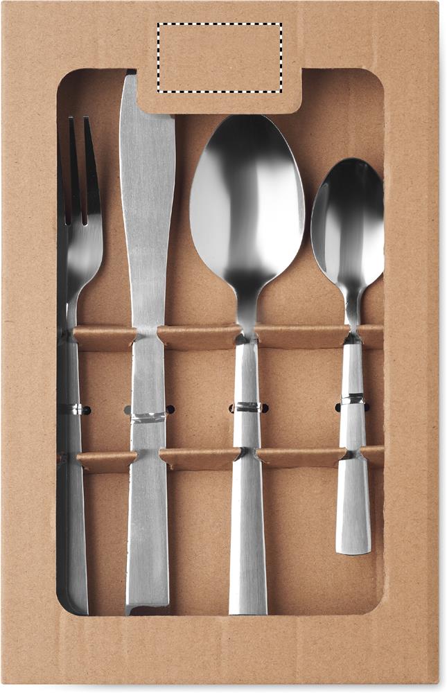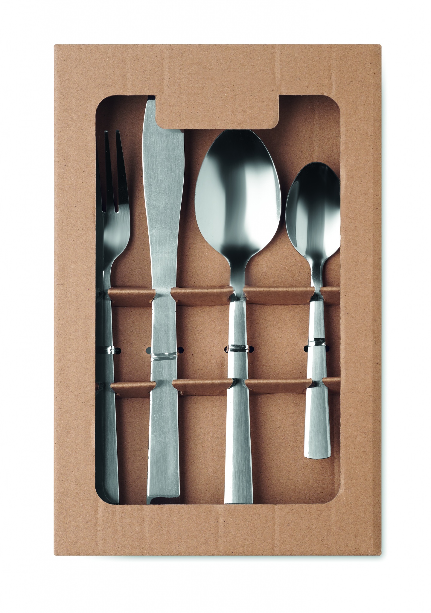 16 daļu nerūsējošā tērauda galda piederumu komplekts 4 galda piederumu komplektiem. Ieskaitot: tējas karoti, galda karoti, dakšiņu, nazi. Prezentēts kraftpapīra kastītē.