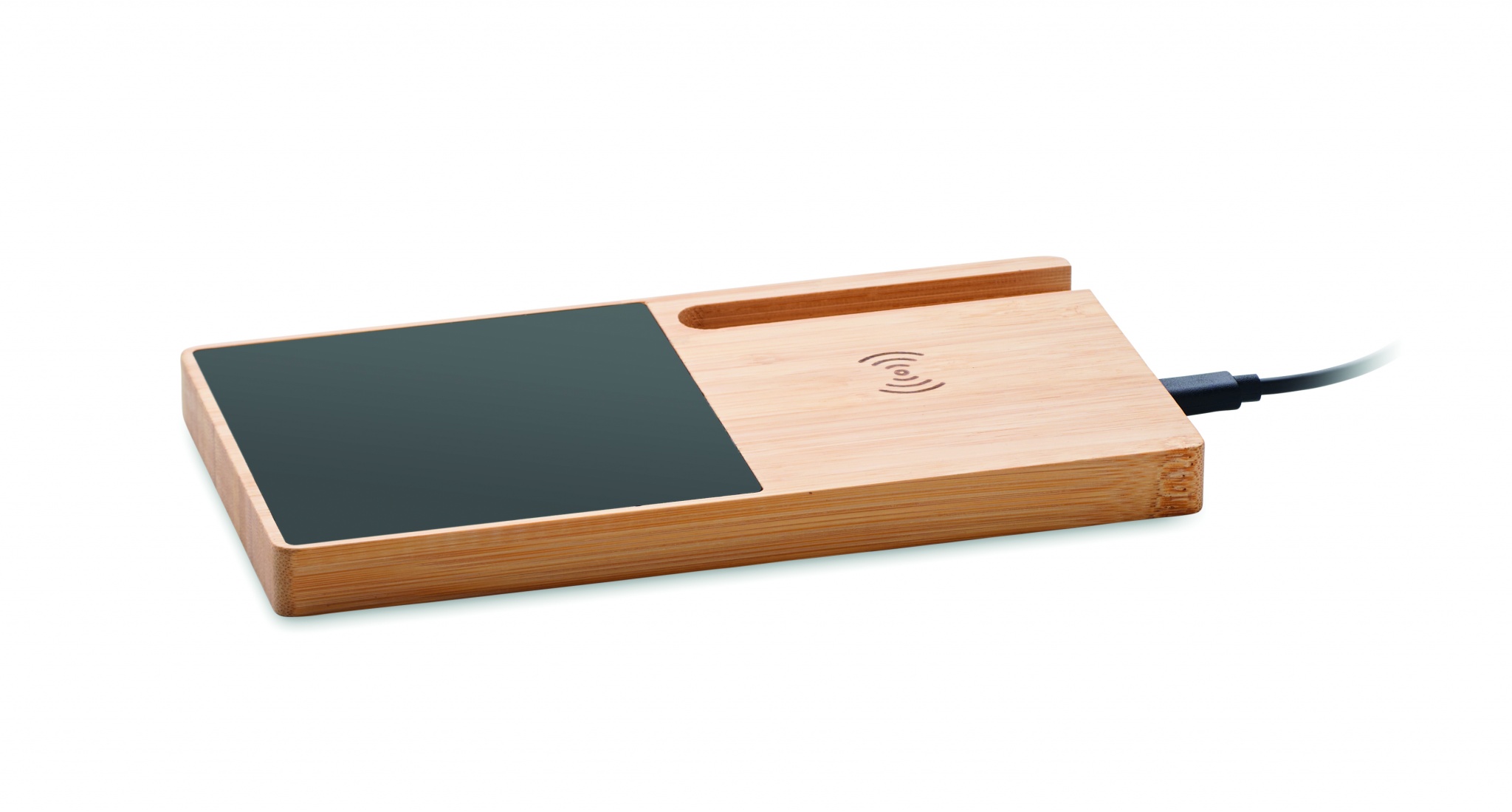 Bezvadu lādētājs no bambusa, ieskaitot krūzes sildītāju un tālruņa statīvu. Savienojiet ierīci ar datoru, novietojiet viedtālruni uz tā un ļaujiet tai uzlādēties. Izeja: DC 9V/1.67A (15W). Savietojams ar visām QI iespējotām ierīcēm, piemēram, jaunākajām Android ierīcēm, iPhone® 8, X un jaunākām ierīcēm.