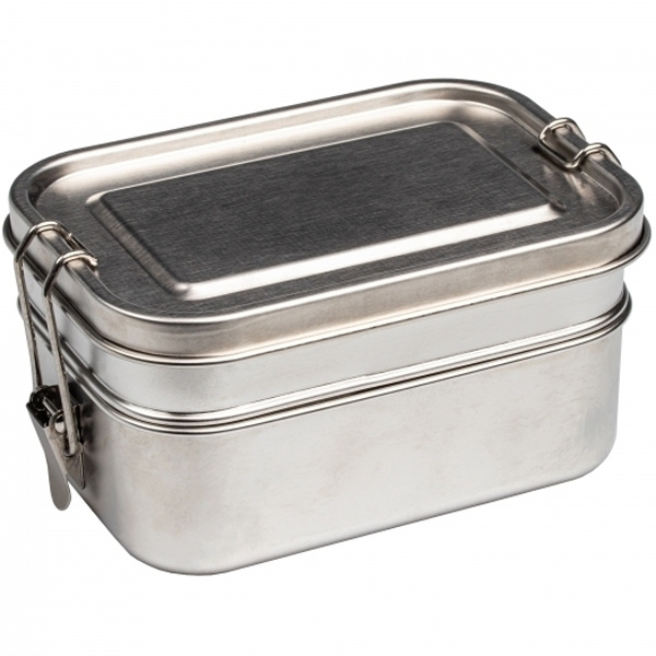 Divstāvu, izturīga, videi draudzīga un robusta pusdienu kastīte (apakšējā 700 ml ietilpība, augšējā 450 ml ietilpība) izgatavota no nerūsējošā tērauda ar vāku, kas aizverams ar skavu abās pusēs. Jūsu logotips tiks iegravēts uz vāka.