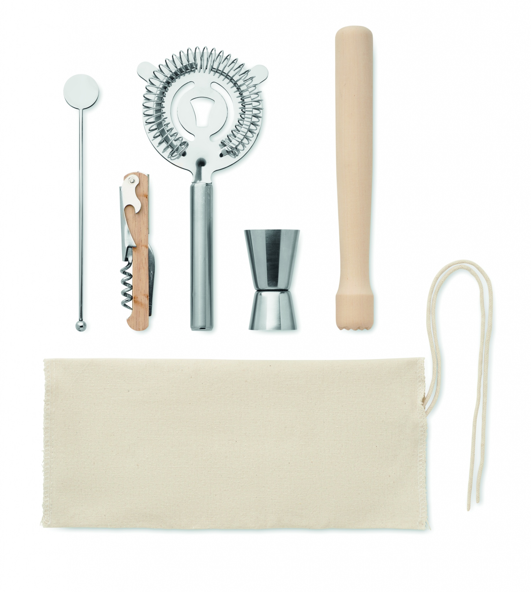 Kokteiļu komplekts kokvilnas maisiņā ar auklu. Iekļauti 5 gabali: divpusējs mērinstruments (15 un 30 ml), koka maisītājs, kokteiļu sietiņš, dzērienu maisītājs un viesmīļa korķviļķis.