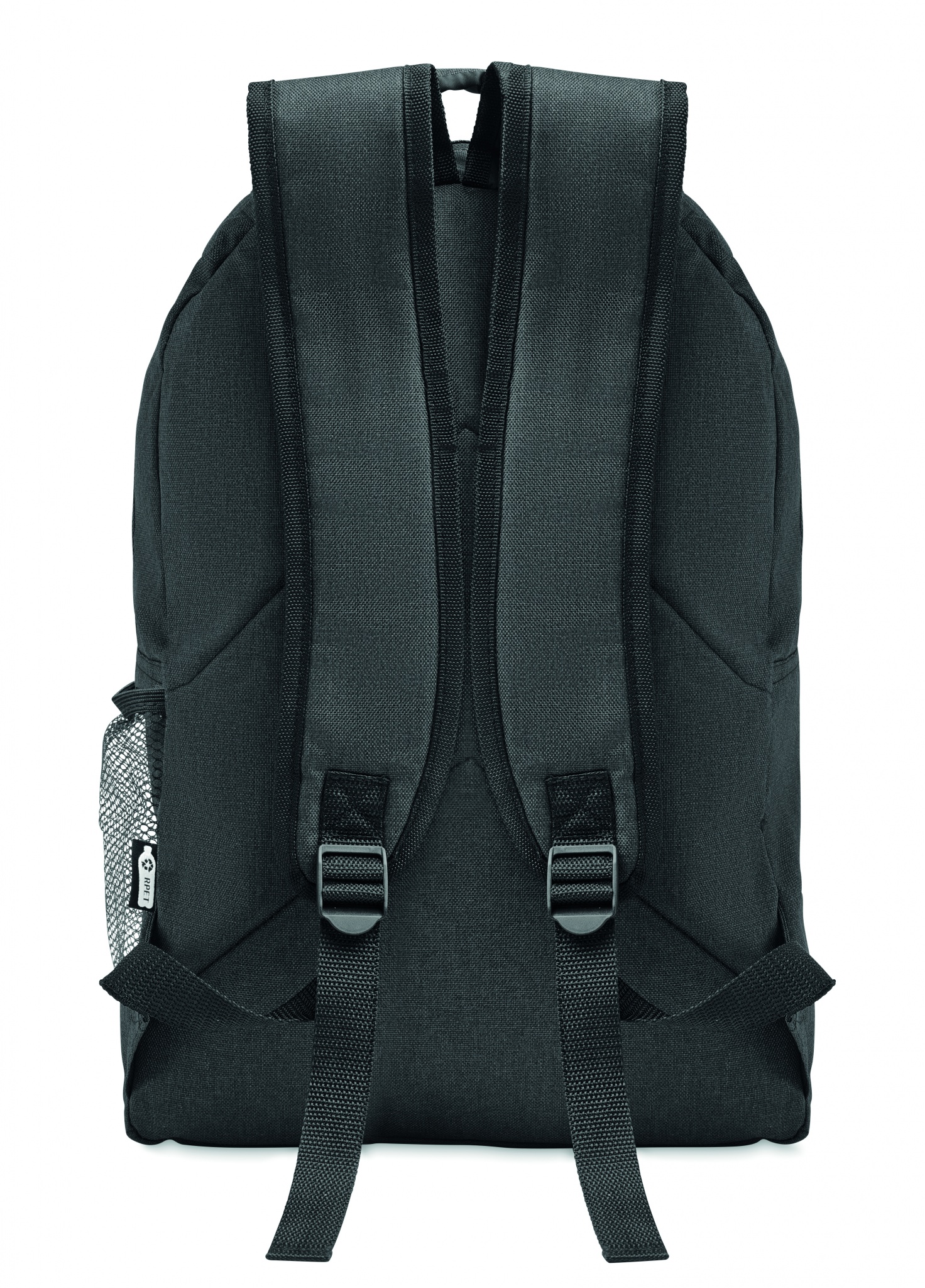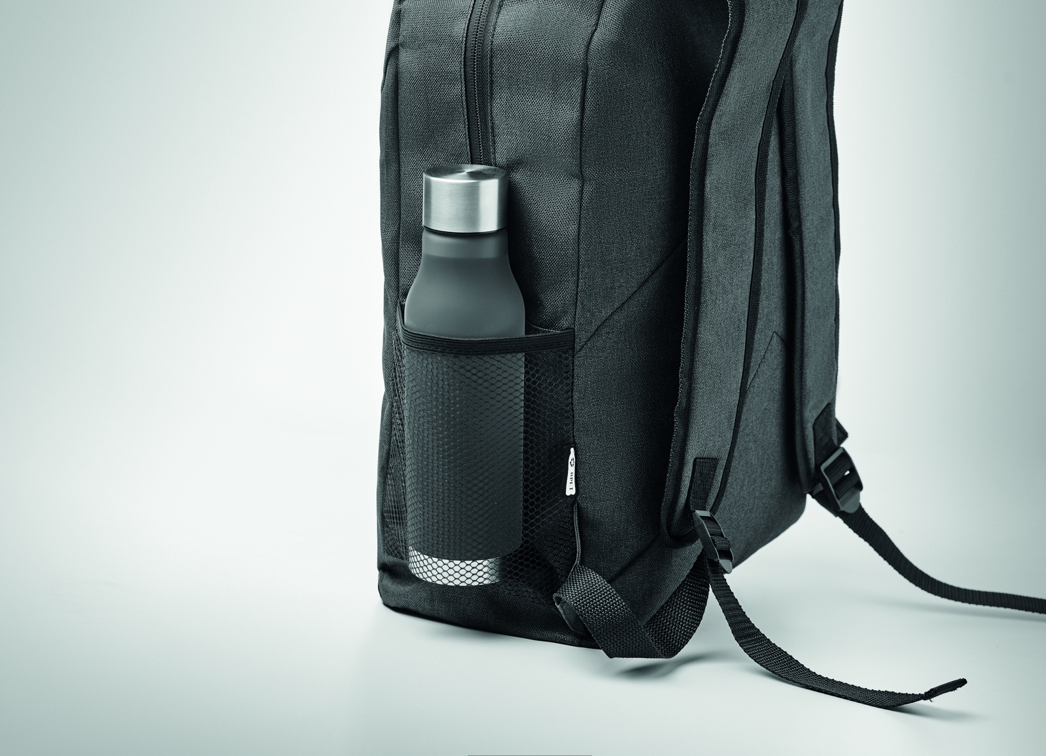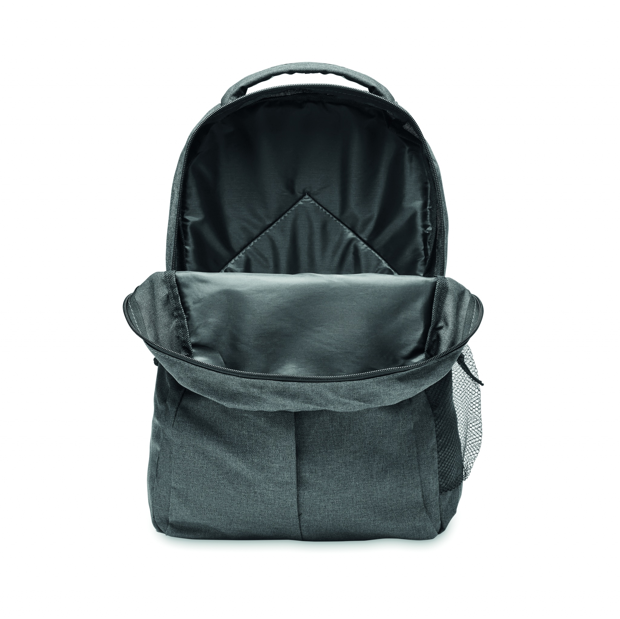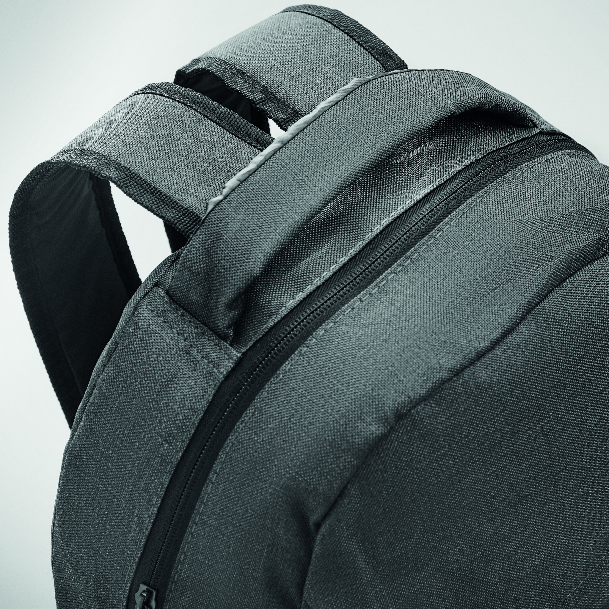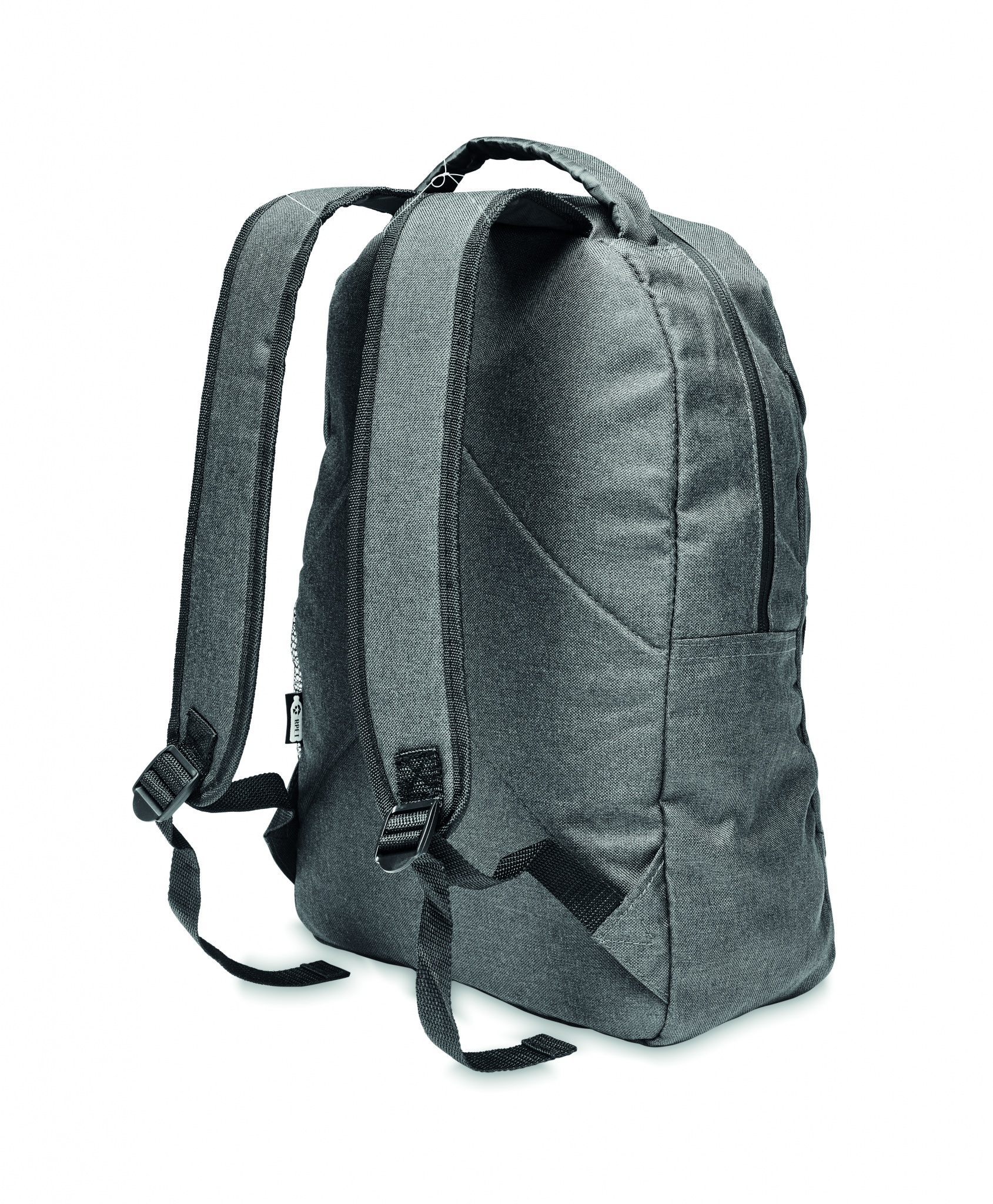 Mugursoma no 600D RPET 2 toņu poliestera ar ārējo kabatu ar rāvējslēdzēju un sieta kabatu sānos.