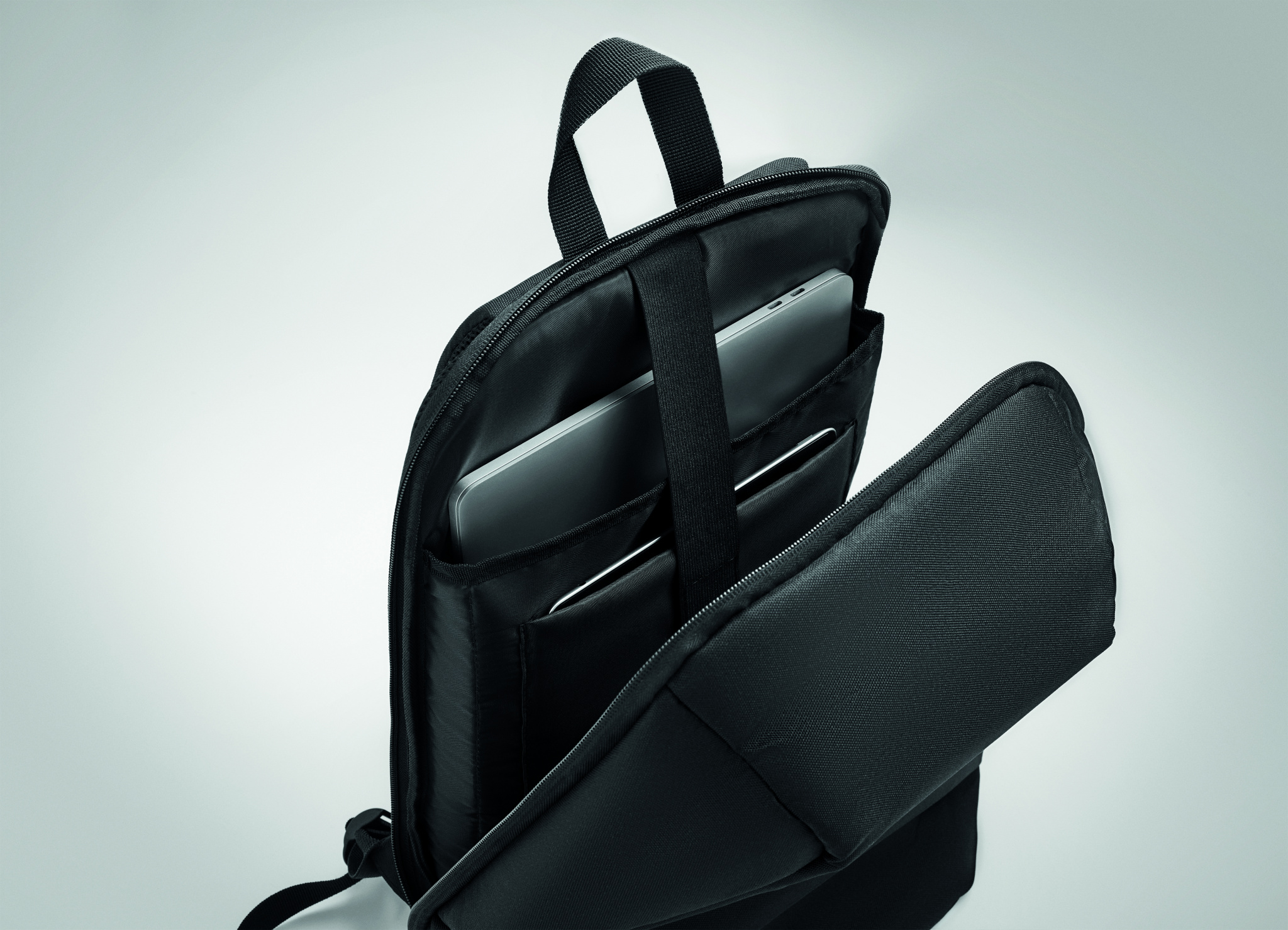 15 collu klēpjdatora mugursoma ar aizsardzību pret zādzībām no 600D RPET poliestera. Vairāki nodalījumi, no kuriem viens ir polsterēts planšetdatoram un citām lietām. Polsterētas plecu siksnas un galvenais nodalījums aizmugurē.