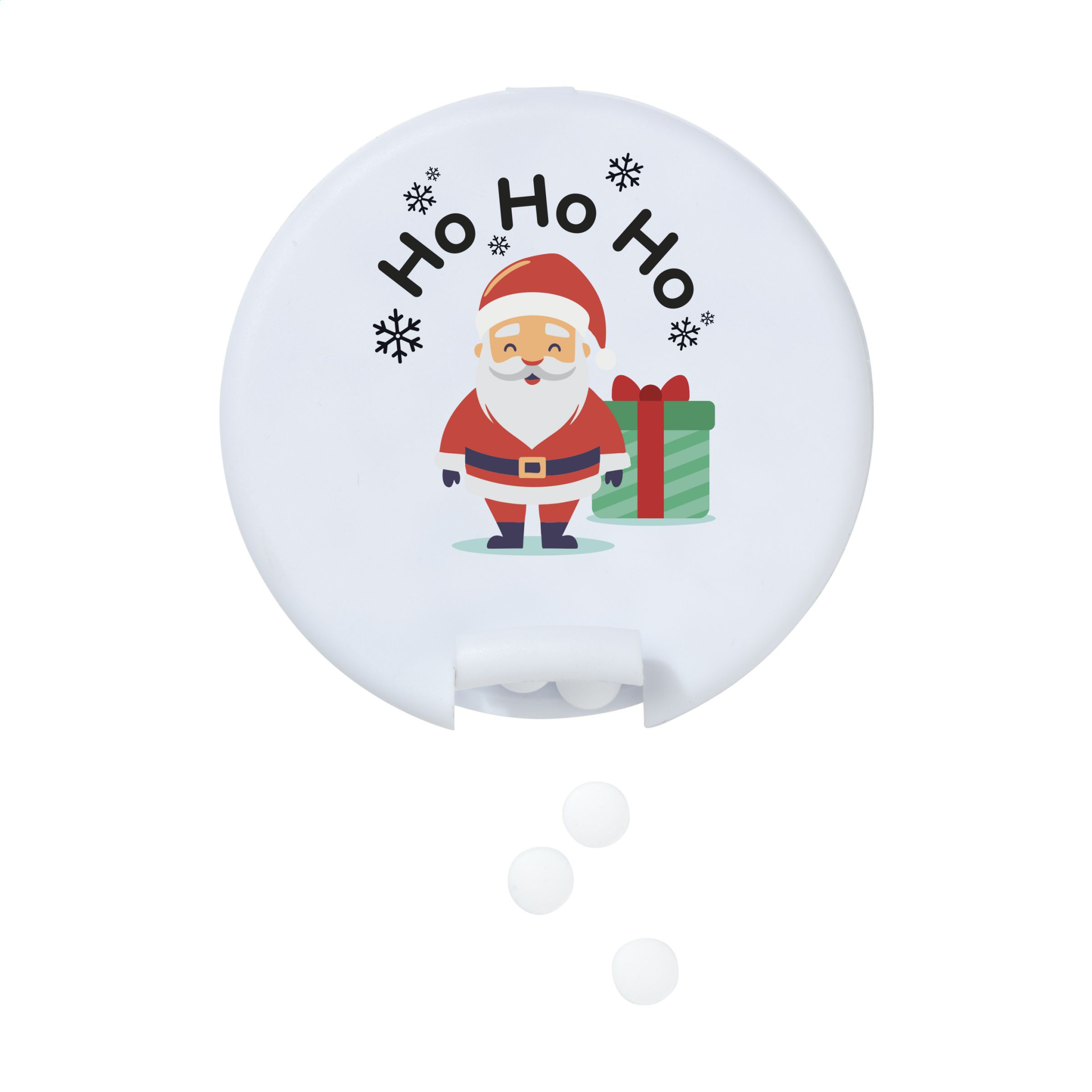 Apaļš plastmasas dozators, kas piepildīts ar apm. 12 g (55 gabali) bezcukura piparmētru. - Šis produkts ir apdrukāts ar standarta Ziemassvētku dizainu. 6 dažādu dizainu izvēle, kā parādīts attēlos. Nav iespējams pielāgot dizainu.