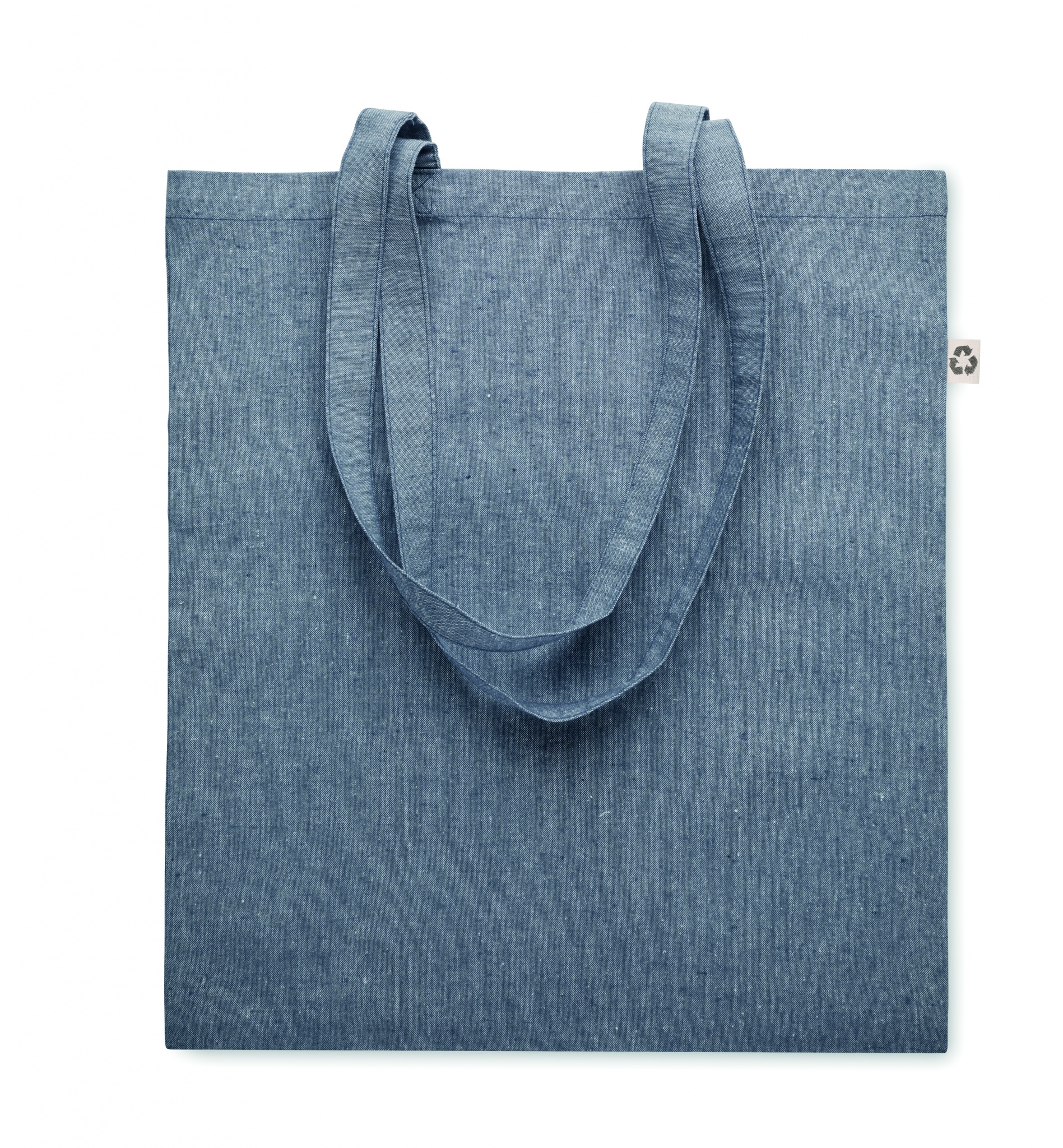 Pārstrādātas kokvilnas iepirkumu maisiņš (80% pārstrādāta kokvilna, 20% kokvilna) ar gariem rokturiem. 140 gr/m².