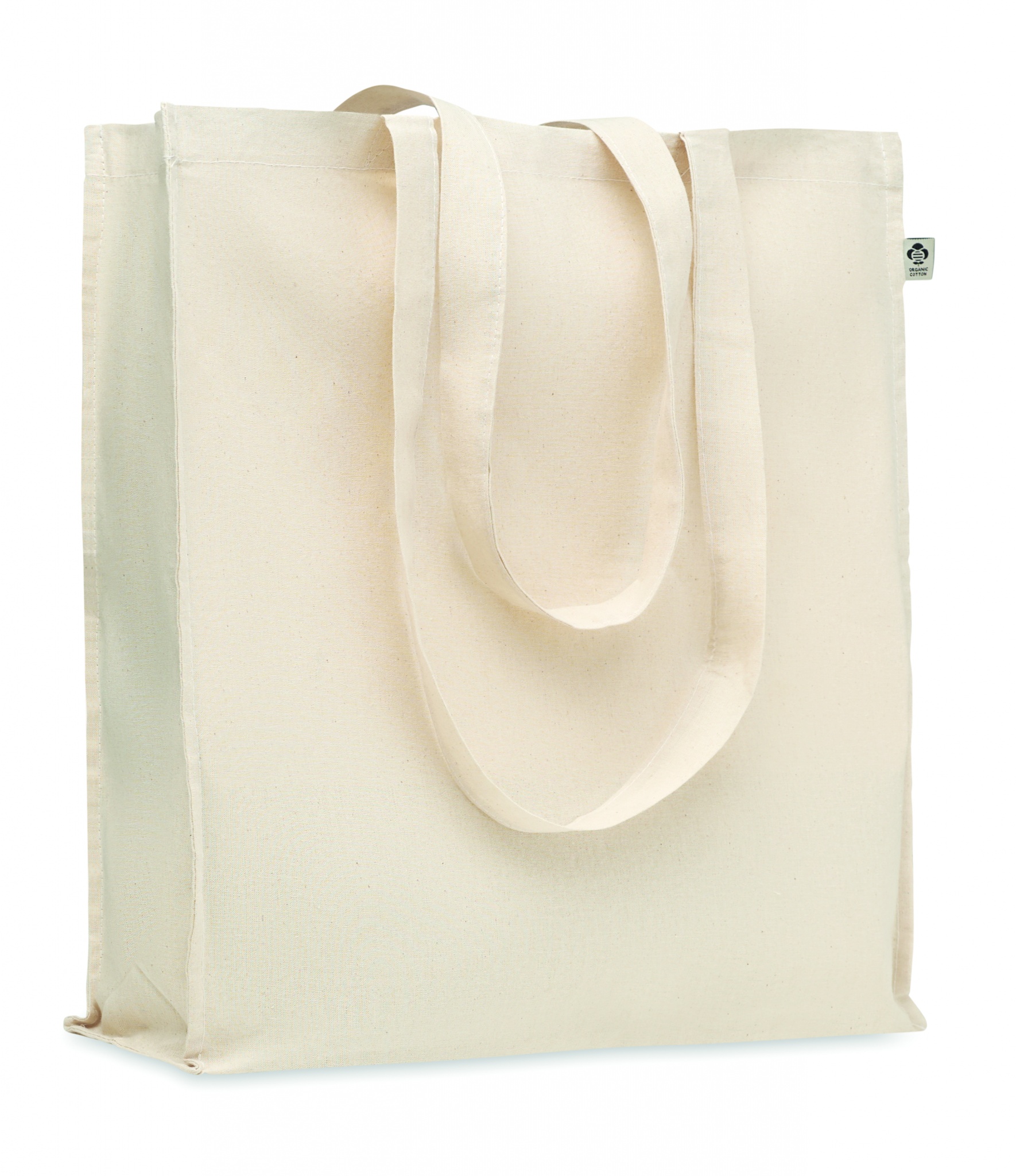 Organiskās kokvilnas iepirkumu maisiņš ar gariem rokturiem un rievojumiem. 140 gr/m².