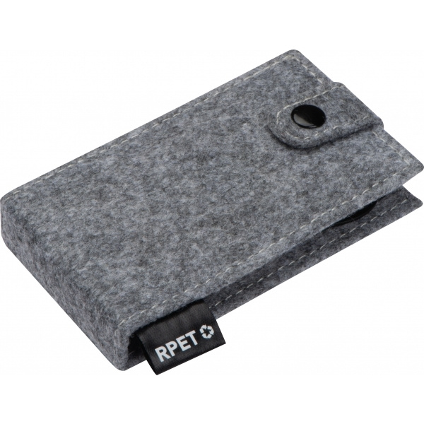 Pievilcīgs manikīra komplekts no filca (pārstrādāts PET). Tajā ietilpst nagu šķēres, nagu vīle, nagu knaibles, pincete un divi kutikulas spiedēji. Mēs ievietojam jūsu logotipu korpusa priekšpusē.