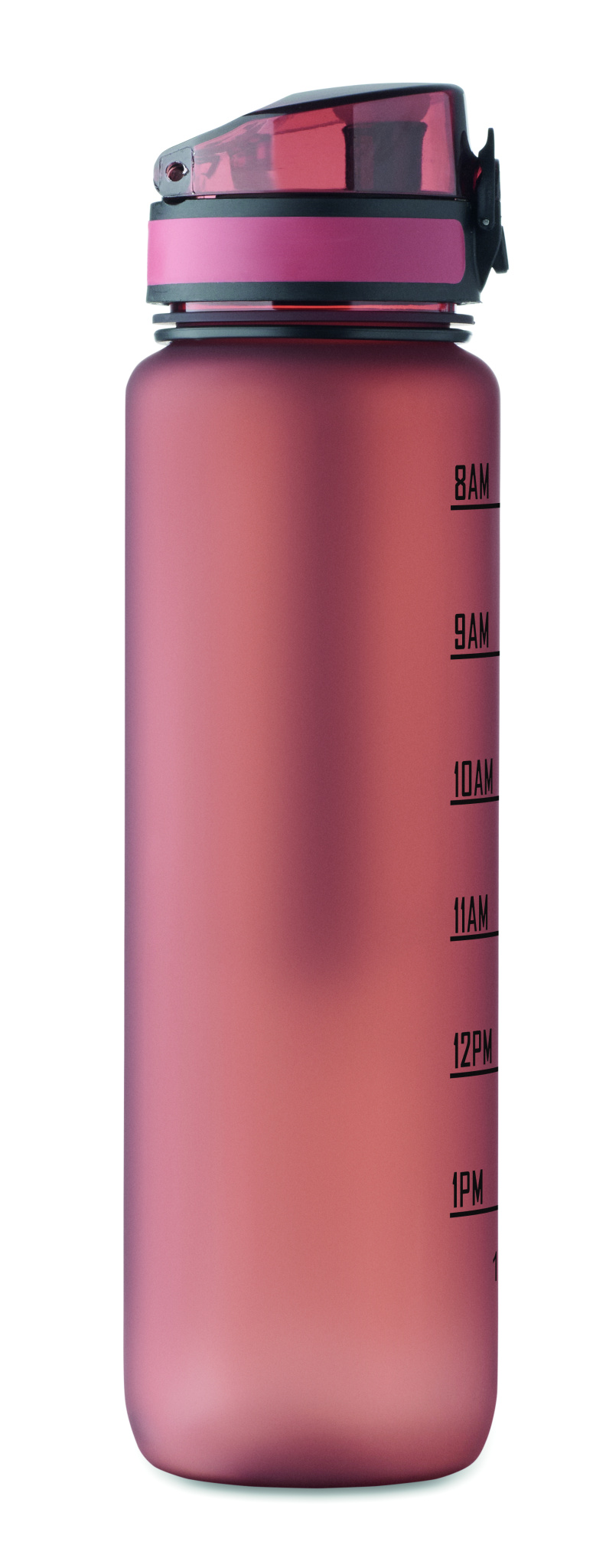 Sporta ūdens pudele no RPET materiāla ar motivējošām laika atzīmēm, ar vienu roku atveramu vāku, drošības aizslēgu un pārnēsāšanas siksnu. Nenoplūst. Tilpums: 1 l.