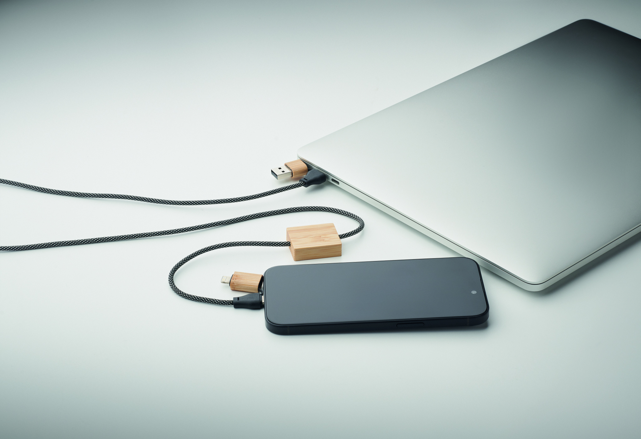 60W charging cable in RPET with bamboo details. Input: 2-in-1 Type-C and Type-A. Output: Type-C and 2 in 1 pin.