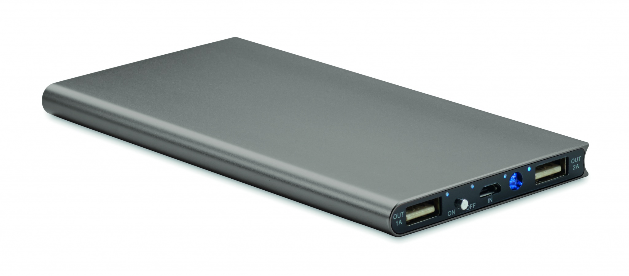 Аккумулятор на 8000 mAh из алюминия. Для использования на смартфонах. Разъем DC5V/1A и DC5V/2A. Включает индикатор и USB шнур с микро USB штекером.