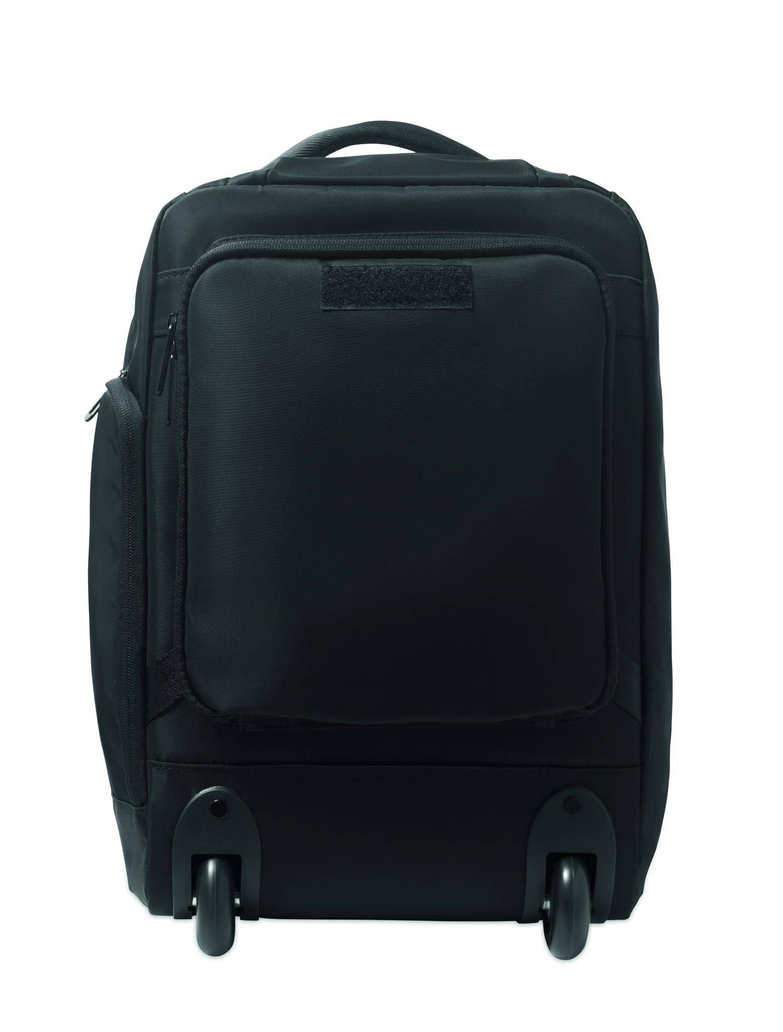 Backpack trolley in 290T RPET polyester with three front zip pockets, padded 15'' laptop compartment, and zippered cooling section. Features padded back, straps, and rear zip strap compartment.