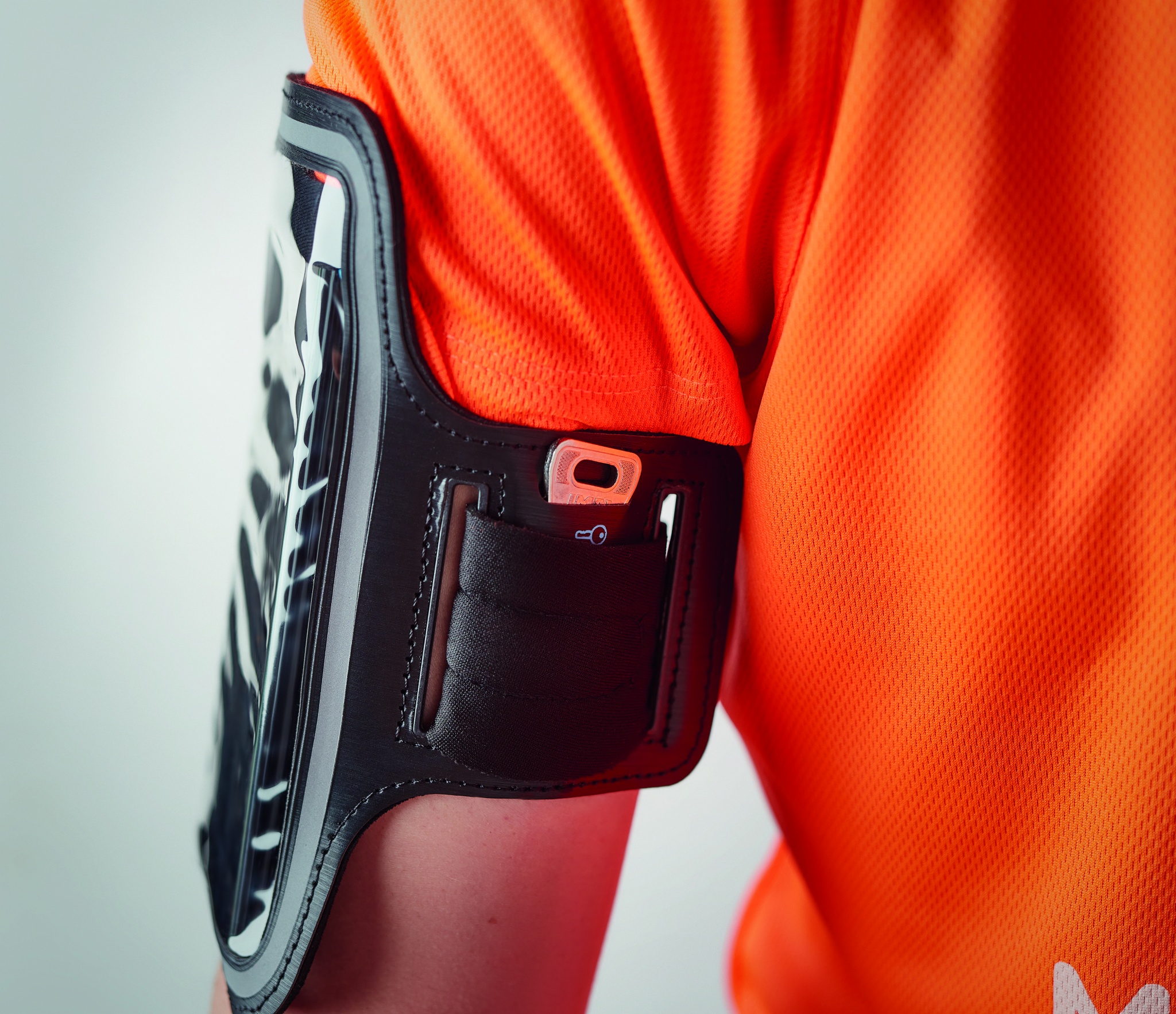 Регулируемый чехол для телефона из неопрена с прозрачной передней частью и светоотражающими деталями. Подходит для телефонов с экраном до 6,5 дюймов.