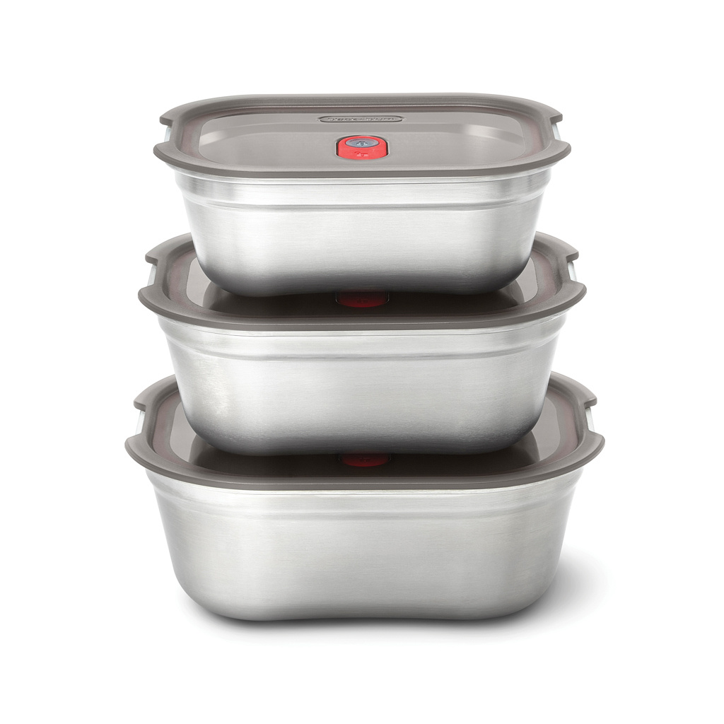 Этот набор из трех контейнеров для приготовления еды из нержавеющей стали, подходящих для микроволновой печи, разработан для повседневного использования — они легкие, прочные и герметичные. Будь то завтрак, обед или перекус, они идеально подходят для хранения продуктов, перекусов на ходу или блюд, которые можно разогреть в духовке. Каждый контейнер имеет инновационную стальную конструкцию, безопасную для использования в микроволновой печи, с вакуумной герметичной крышкой, которая дольше сохраняет свежесть продуктов. Полупрозрачная крышка позволяет сразу увидеть содержимое, а высококачественное основание из нержавеющей стали можно мыть в посудомоечной машине, замораживать и использовать в духовке (крышку нельзя использовать в духовке). Съемные уплотнители упрощают очистку. Уникальное вентиляционное отверстие на крышке позволяет разогревать еду в микроволновой печи, не снимая крышку, что сокращает время нагрева и предотвращает разбрызгивание. Эти контейнеры без BPA, разработанные для компактного хранения или штабелирования при использовании того же размера, предлагают продуманную функциональность для каждого приема пищи.