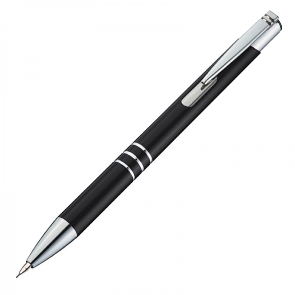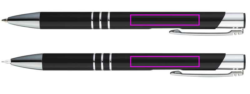 Письменный набор из алюминия, состоящий из шариковой ручки с синим стержнем большой емкости и механического карандаша, каждый с декоративными кольцами. Ваш логотип будет выгравирован справа от зажима.