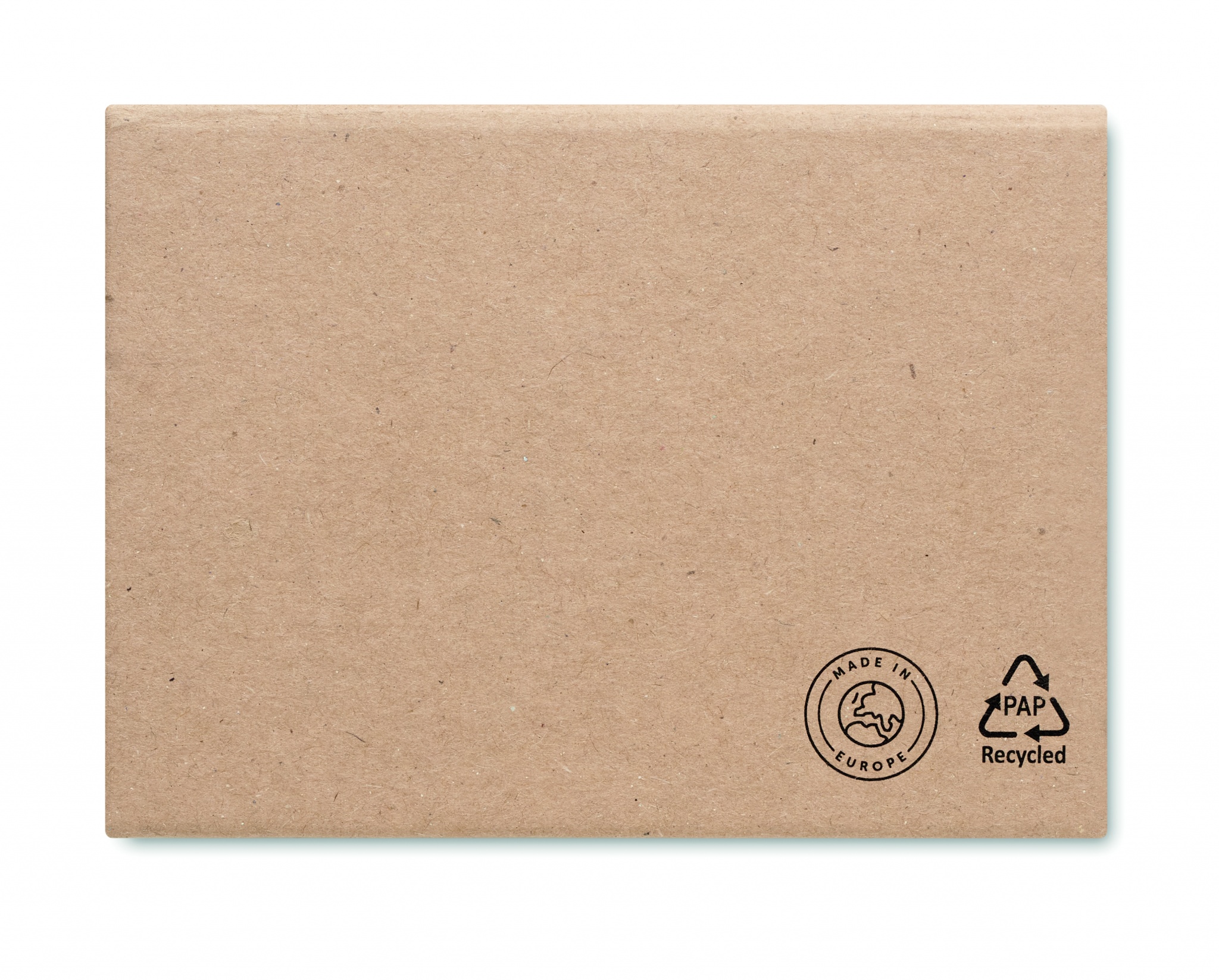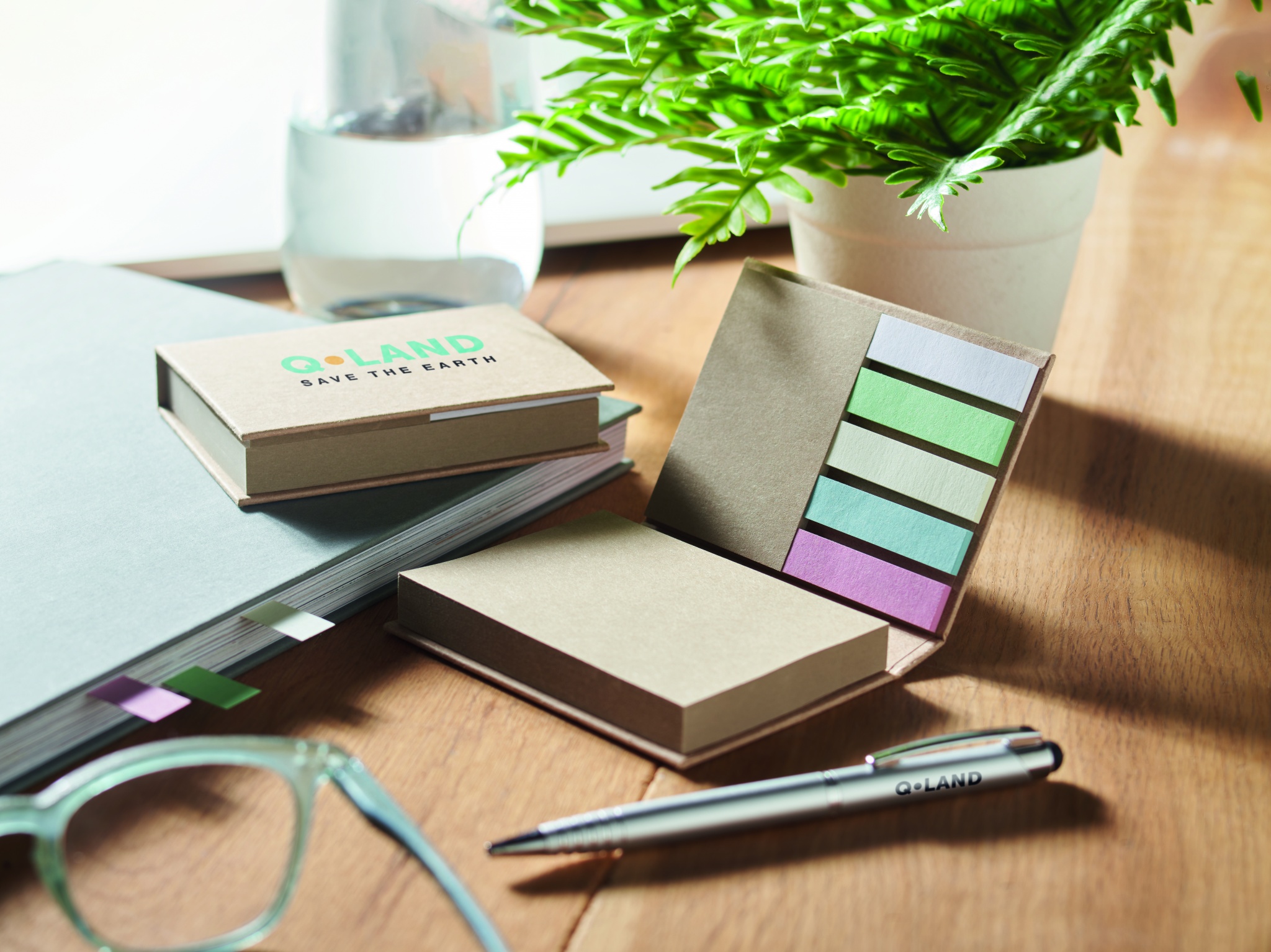 Набор для заметок в обложке из переработанной бумаги. Большой и средний блоки состоят из стикеров. Есть 5 видов закладок для страниц разных цветов. Сделано в ЕС.