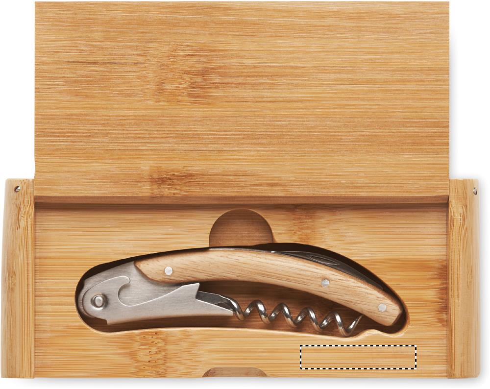 Оригинальный нож официанта из нержавеющей стали с двойной открывалкой и штопором с бамбуковым покрытием. Поставляется в бамбуковой подарочной коробке.