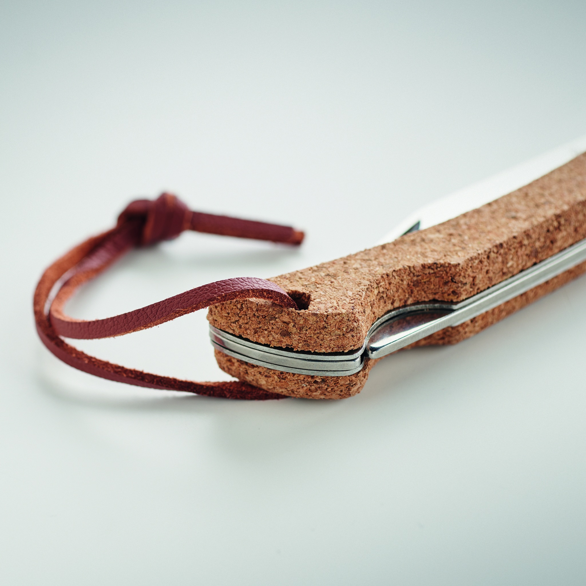 Складной нож из нержавеющей стали с пробковой ручкой и шнурком из полиуретана.