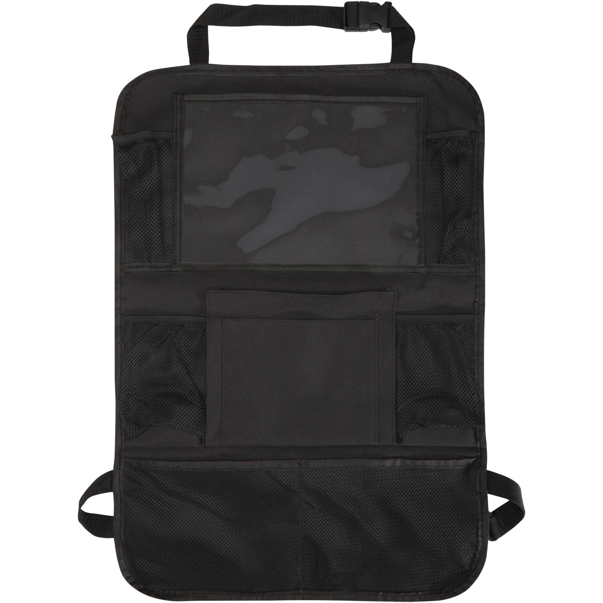 Органайзер на заднее сиденье автомобиля с несколькими сетчатыми карманами для хранения предметов первой необходимости, таких как закуски, игрушки или бутылки, а также окошком из ПВХ для планшета. Он легко крепится к переднему сиденью и помогает поддерживать порядок в автомобиле — идеально подходит для семей, путешествий на автомобиле или повседневного использования.