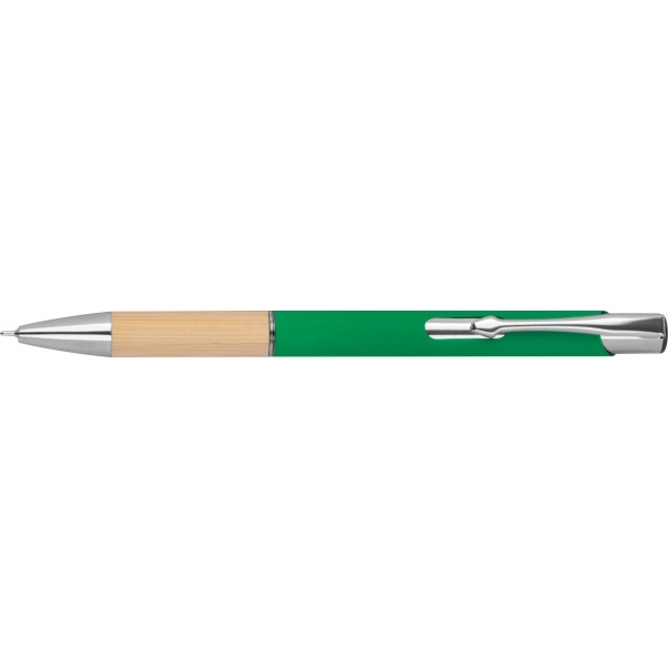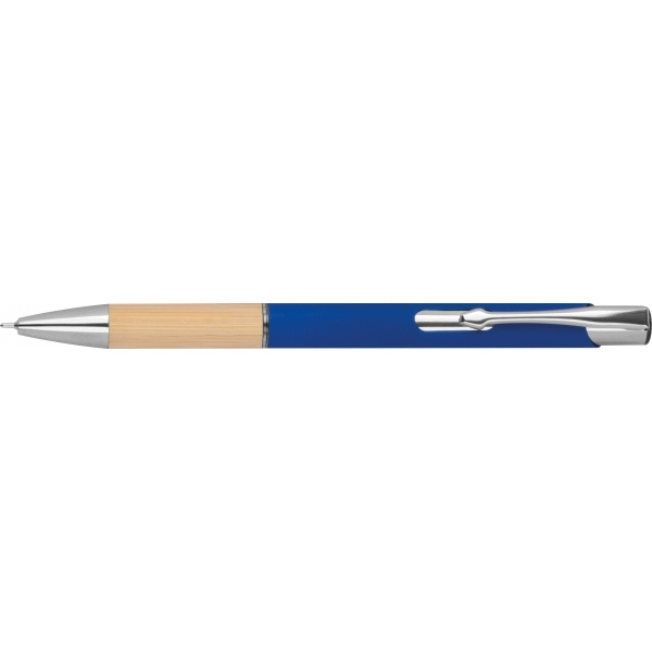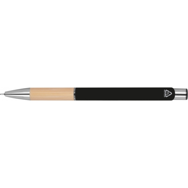 Полугелевая ручка из переработанного алюминия с резиновой отделкой. Также имеет бамбуковую зону захвата, синий пластиковый стержень (наконечник 0,5 мм) и серебристые акценты.