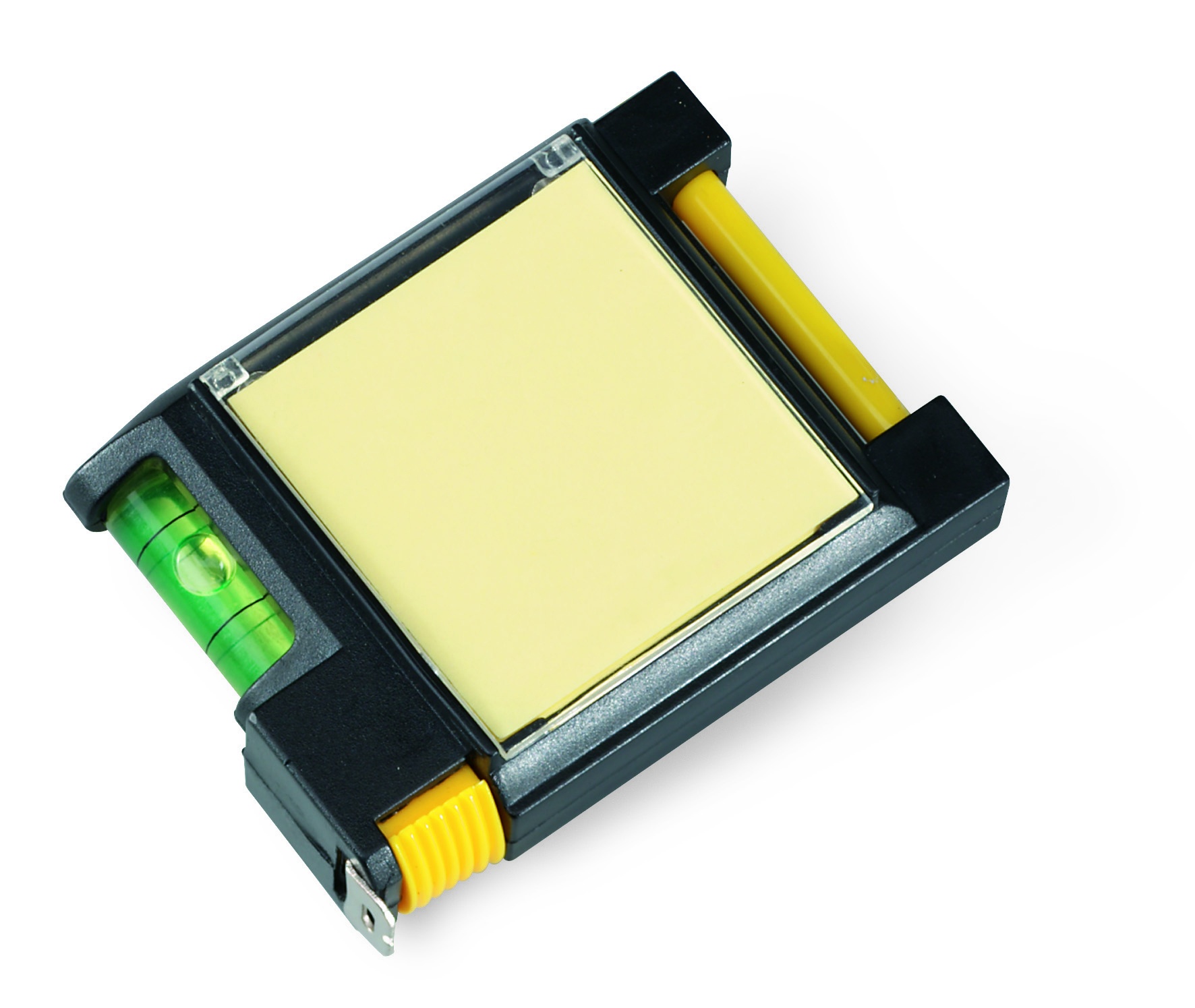 Рулетка измерительная 2 м. Включает блок для заметок, шариковую ручку и уровень.