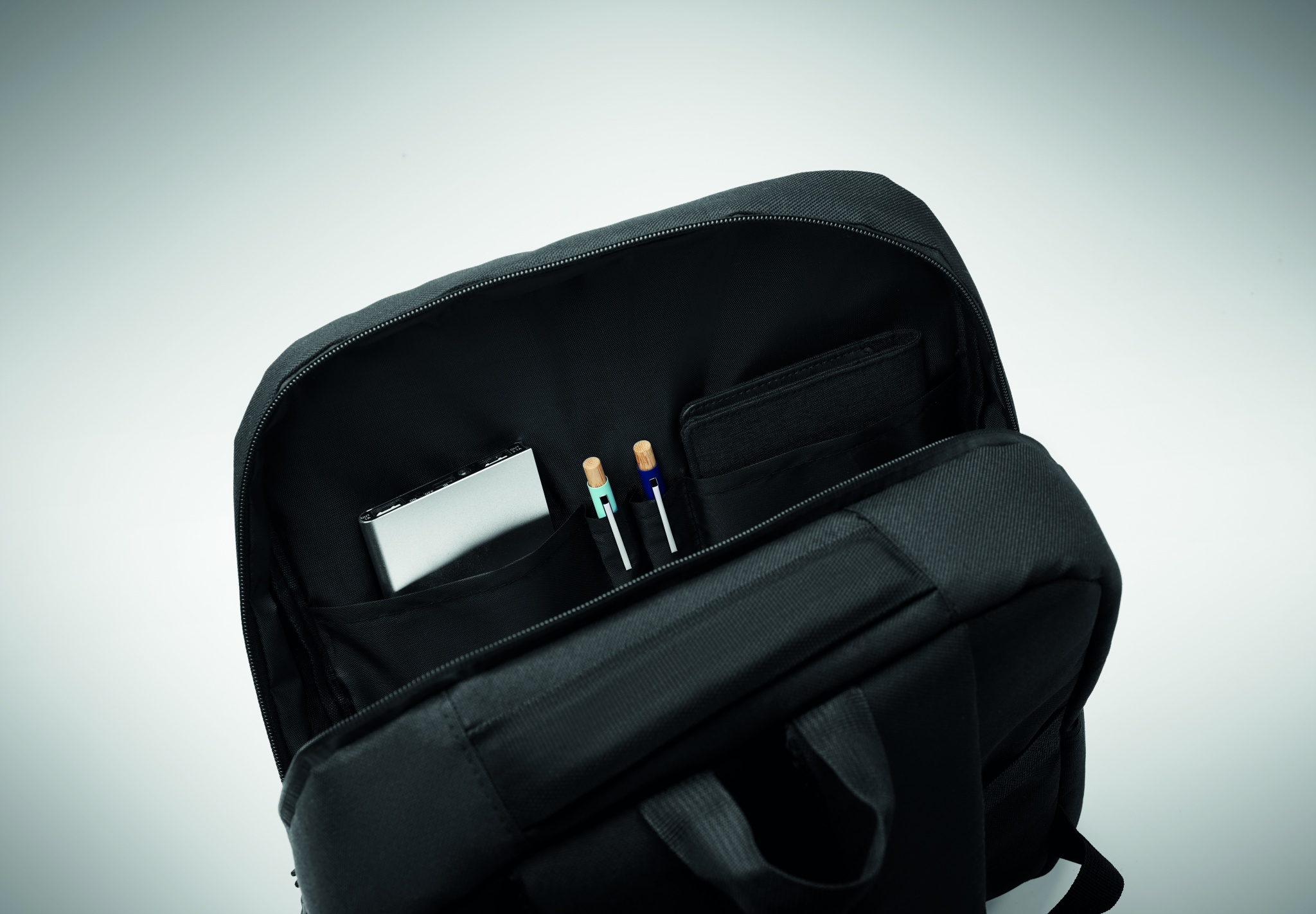 Тонкий рюкзак из переработанного полиэстера 600D, подкладка 210D. Отделение для 15-дюймового ноутбука. Внешний карман на молнии для 10-дюймового планшета, 2 внутренних кармана, 2 отделения для ручек, передний карман на молнии. 2 боковых кармана. Спинка и плечевые ремни с мягкой подкладкой. Крепление для чемодана.