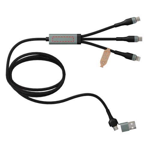 Кабель для сверхбыстрой заряжки 5-в-1, изготовленный из rPET, мощностью 100 Вт, которым можно заряжать смартфоны, планшеты и ноутбуки. Двойной вход USB-A + USB-C делает кабель на 100% совместимым с новейшими моделями компьютеров. Выходная мощность: Type-C, Micro USB и Lightning. Поставляется с чехлом из перерабатываемого TPU и вкладышем, напечатанным на переработанной бумаге. Длина кабеля: 1 метр