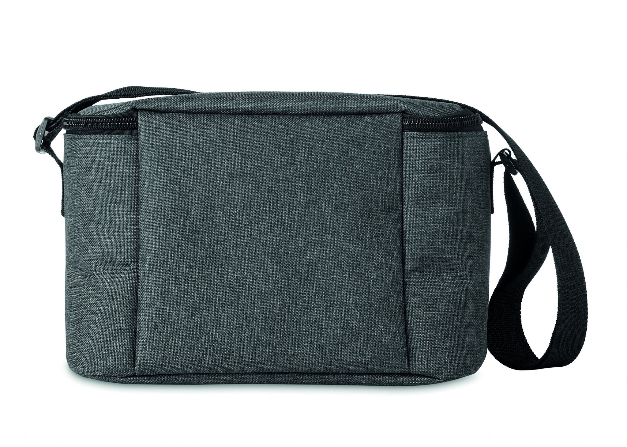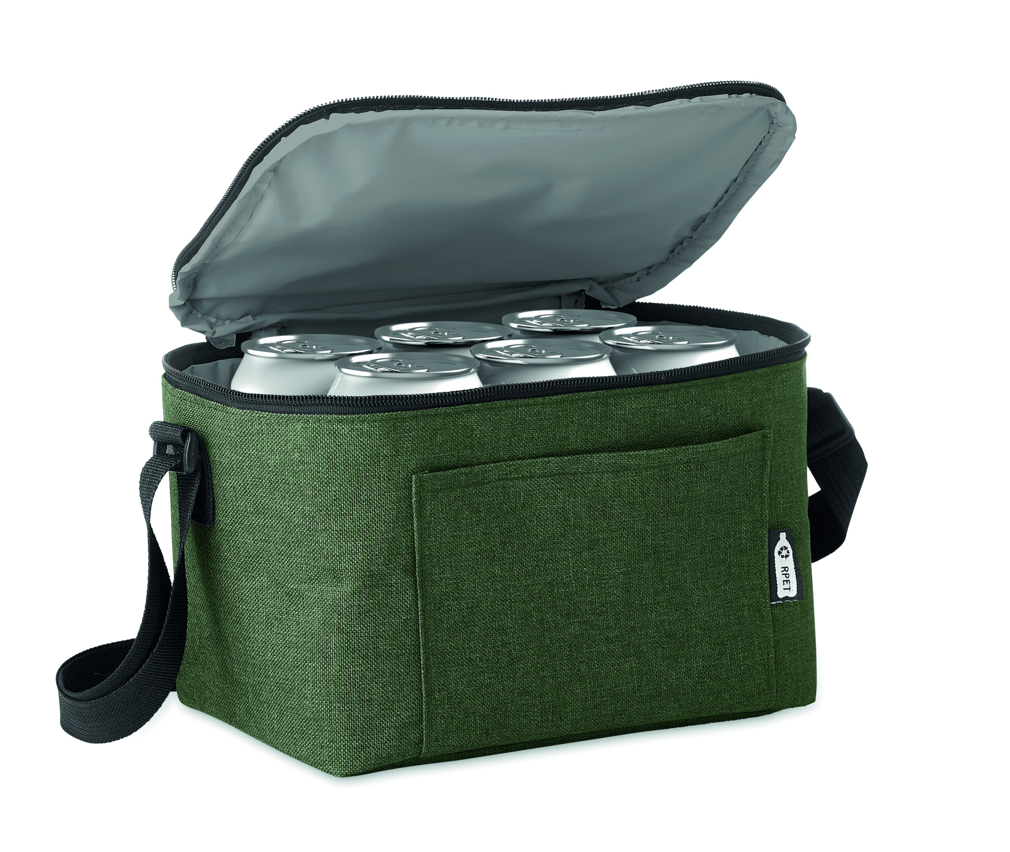 Сумка холодильник с фронтальным карманом на 6 банок в двухцветном RPET 600D. Изоляционный материал: ПЭВА 0,15 мм + пена 3 мм.