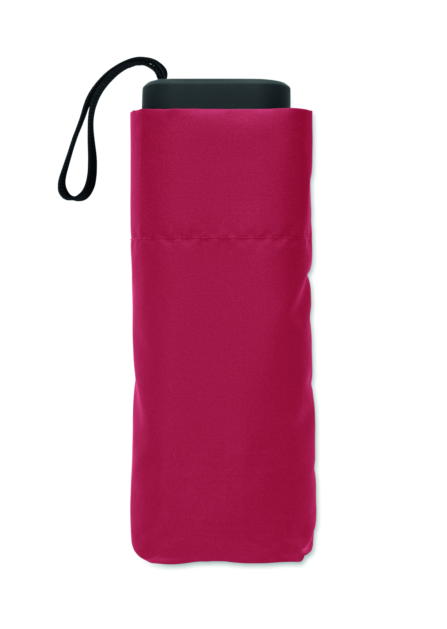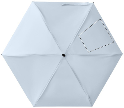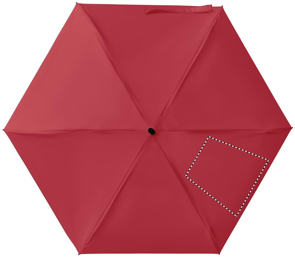 19-tums 5-faldigt manuellt paraply tillverkat av 190T pongee med påse. Det har en vindtät ram i metall och glasfiber, svart gummerat handtag med handledsrem och en kompakt hopfälld storlek på 17 cm.