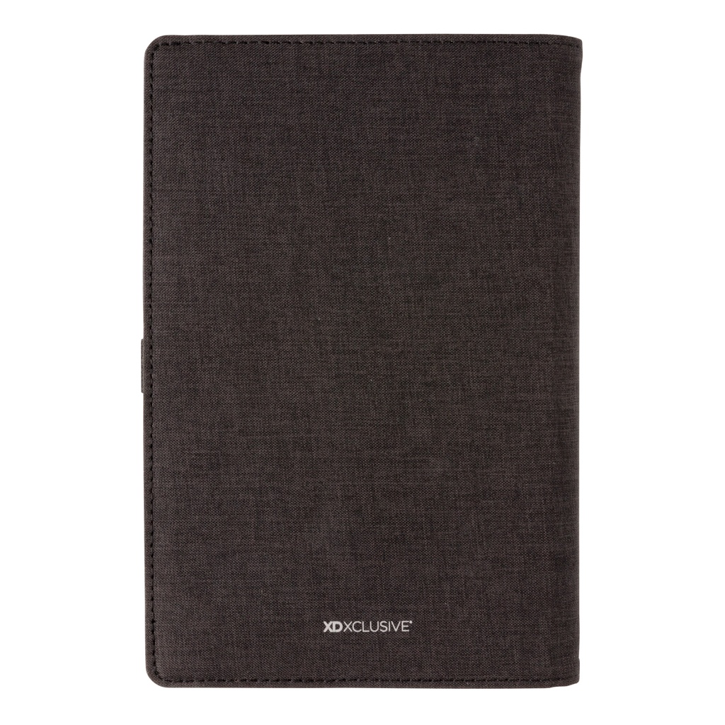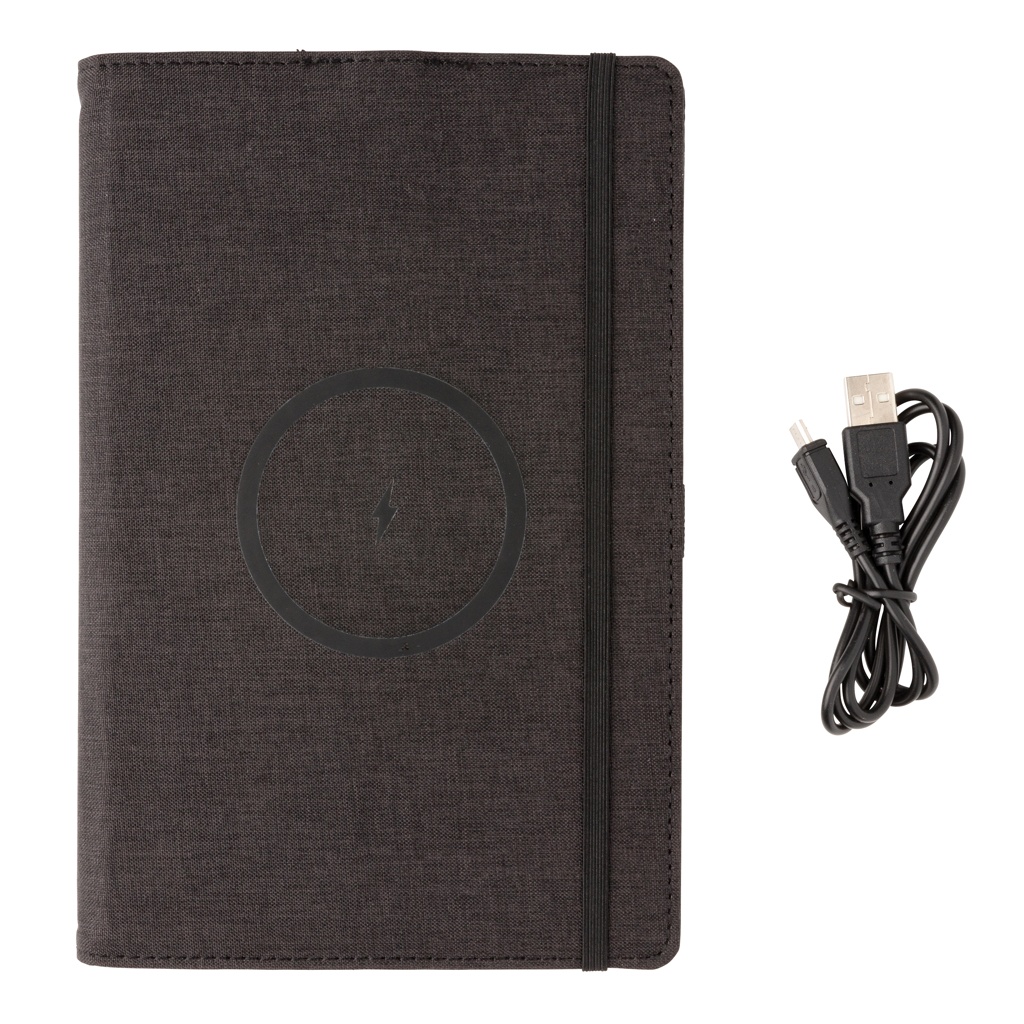 Påfyllningsbart omslag för anteckningsbok med 5W trådlös laddning. Omslaget är tillverkat i polyester och har ett elastiskt band. Anteckningsboken på insidan har ett svart PU cover och har 80 blad/160 sidor linjerat cremefärgat papper, 70gr/m2. 80 cm micro USB kabel medföljer. Input: 5.0V/2.0 A. Output: 5.0V/1A. Registrerad design®