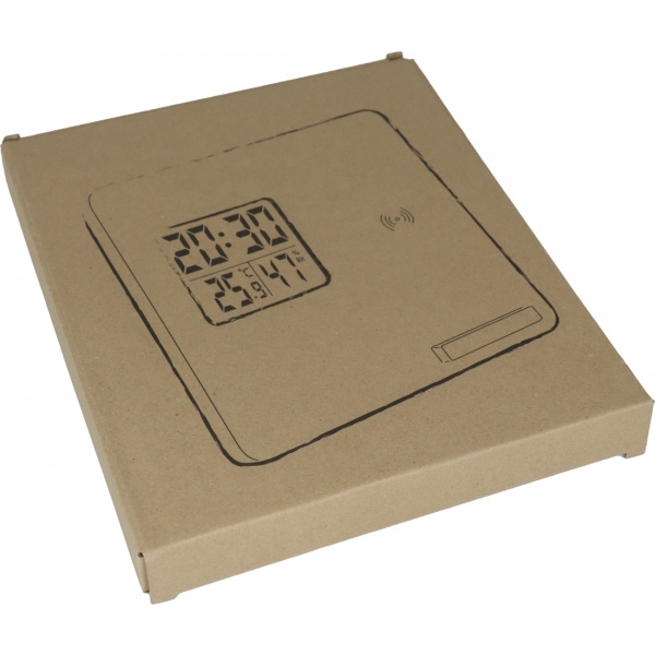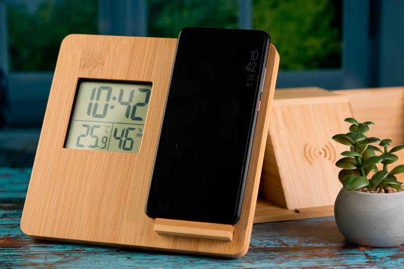 Bambu väderstation / trådlös laddare med digital display som visar temperatur, luftfuktighet och tid. Ger ett stabilt stativ. Din logotyp kommer att graveras på framsidan.