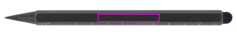 Bläckfri aluminiumpenna med touchfunktion och skala i cm och tum. Blyet är gjort av en blandning på grafit och metall, vilket gör det extremt hållbart. Din logotyp kommer att graveras på det fria utrymmet på pipan.