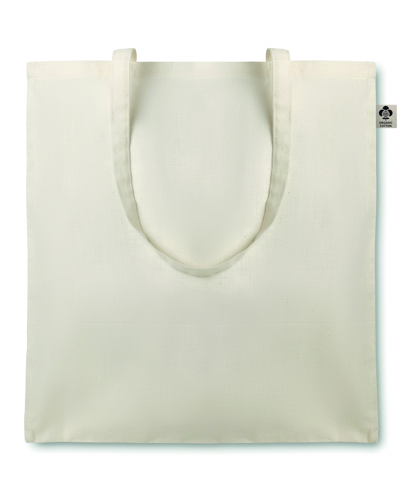 Kasse i ekologisk bomull med långa handtag. 105 gr/m².