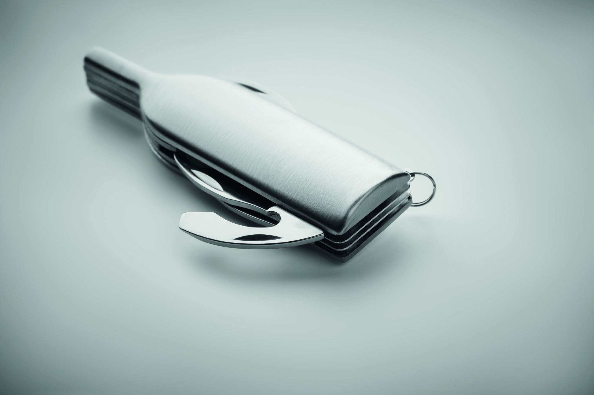 Fickkniv i rostfritt stål i form av en vinflaska med 4 funktioner: kapsylöppnare, kniv, korkskruv och nyckelring.