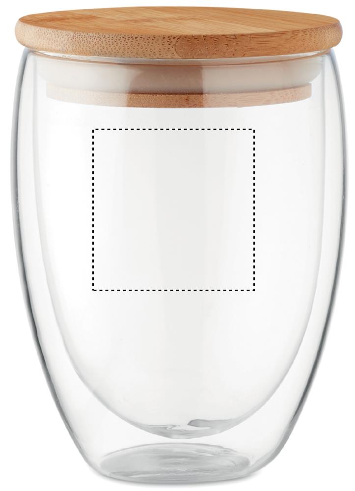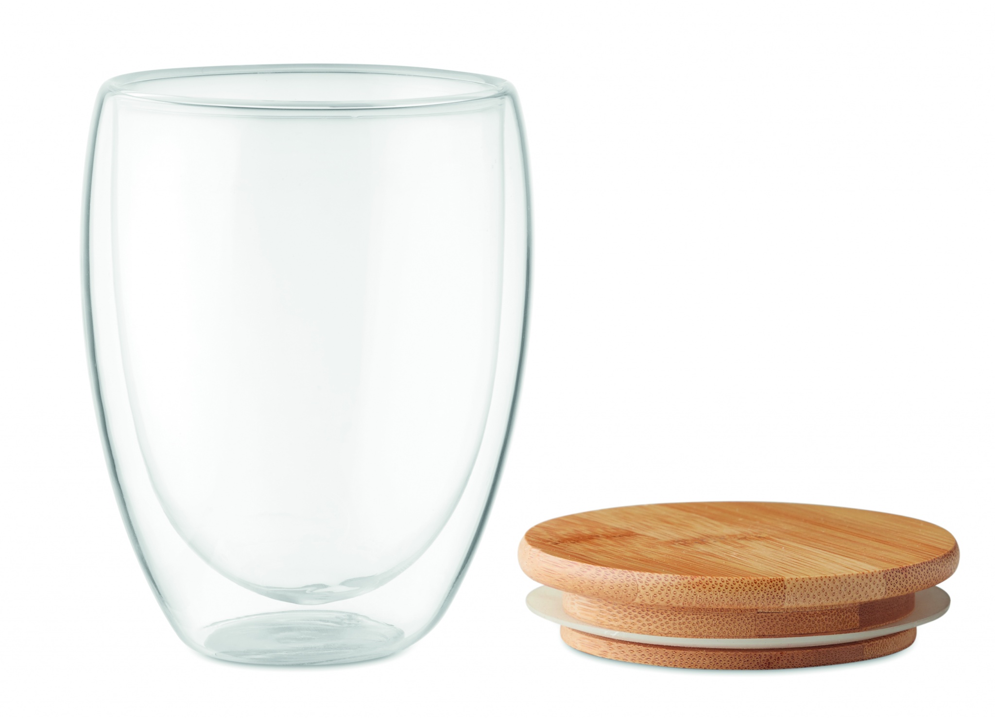 Glas med dubbelvägg i värmeresistent glas med bambu lock som har en silikonring. Volym 350 ml. Eftersom bambu är ett naturligt material kan vissa färgskiftningar förekomma.