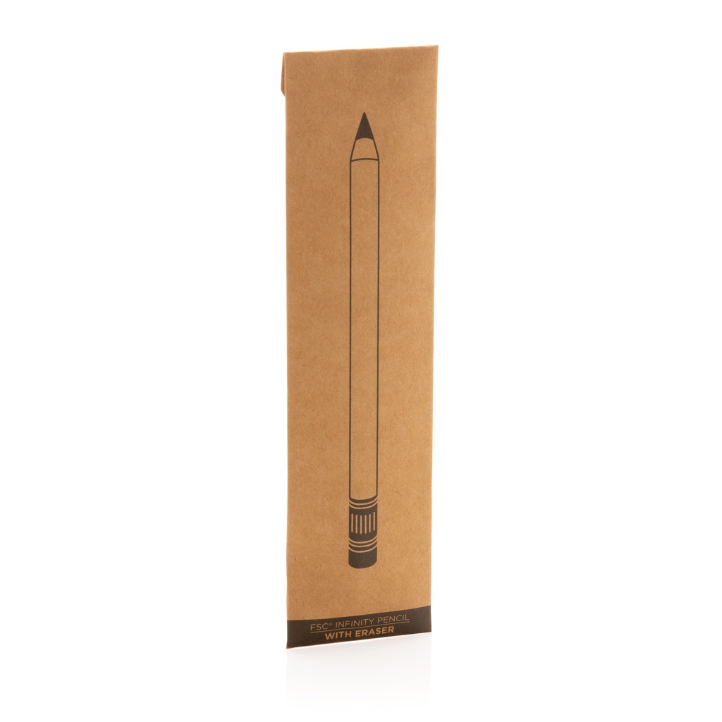 Denna infinity penna med suddgummi ersätter din traditionella blyertspenna i trä. Traditionella blyertspennor i trä har endast ca 200 meter skrift medan denna FSC® bambu infinity penna har upp till 20.000 meter skrift med sin grafitspets för att producera en grafitlinje. Den inte bara skriver som en vanlig blyertspenna, skriften kan även suddas ut. Precis som en vanlig blyertspenna lämnar den en grafitlinje på pappret men pennan slits så långsamt att den räcker längre än 100 traditionella blyertspennor i trä!
