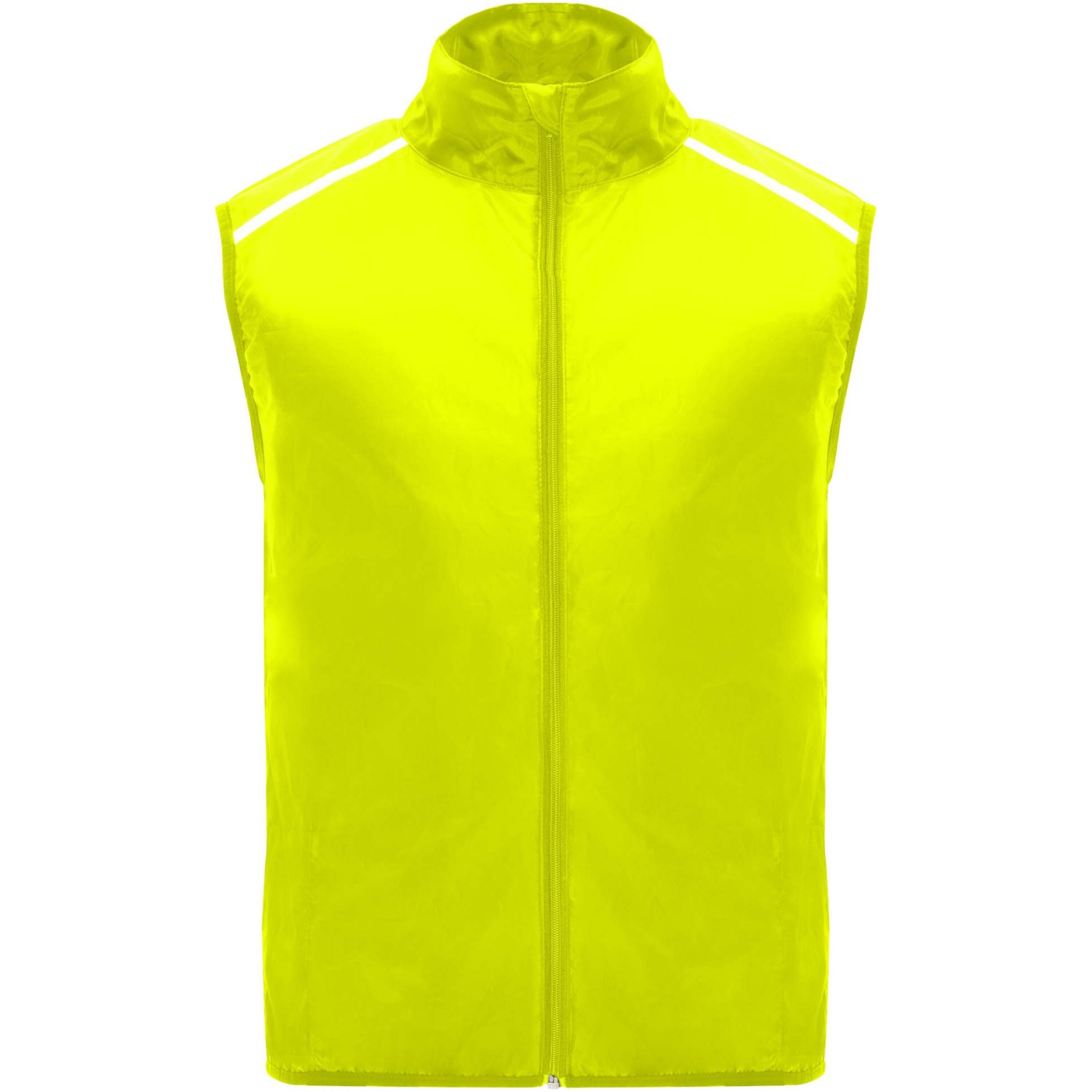 Vindtät och andningsbar. Dragkedja fram med matchande hakskydd. Elastisk bindning vid ärmhål och nederkant. Nedre delen av ryggen i mikroperforerat tyg. Detaljer med hög synlighet på ovansidan, framsidan och baksidan. Ficka med elastiskt band för att förvara västen och bära den på handleden. Avtagbar etikett.