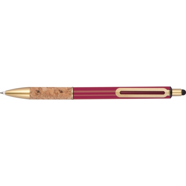 Metallkulpenna med gyllene applikationer, blåskrivande refill och korkgreppszon. Din logotyp kommer att graveras till höger om klippet.