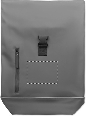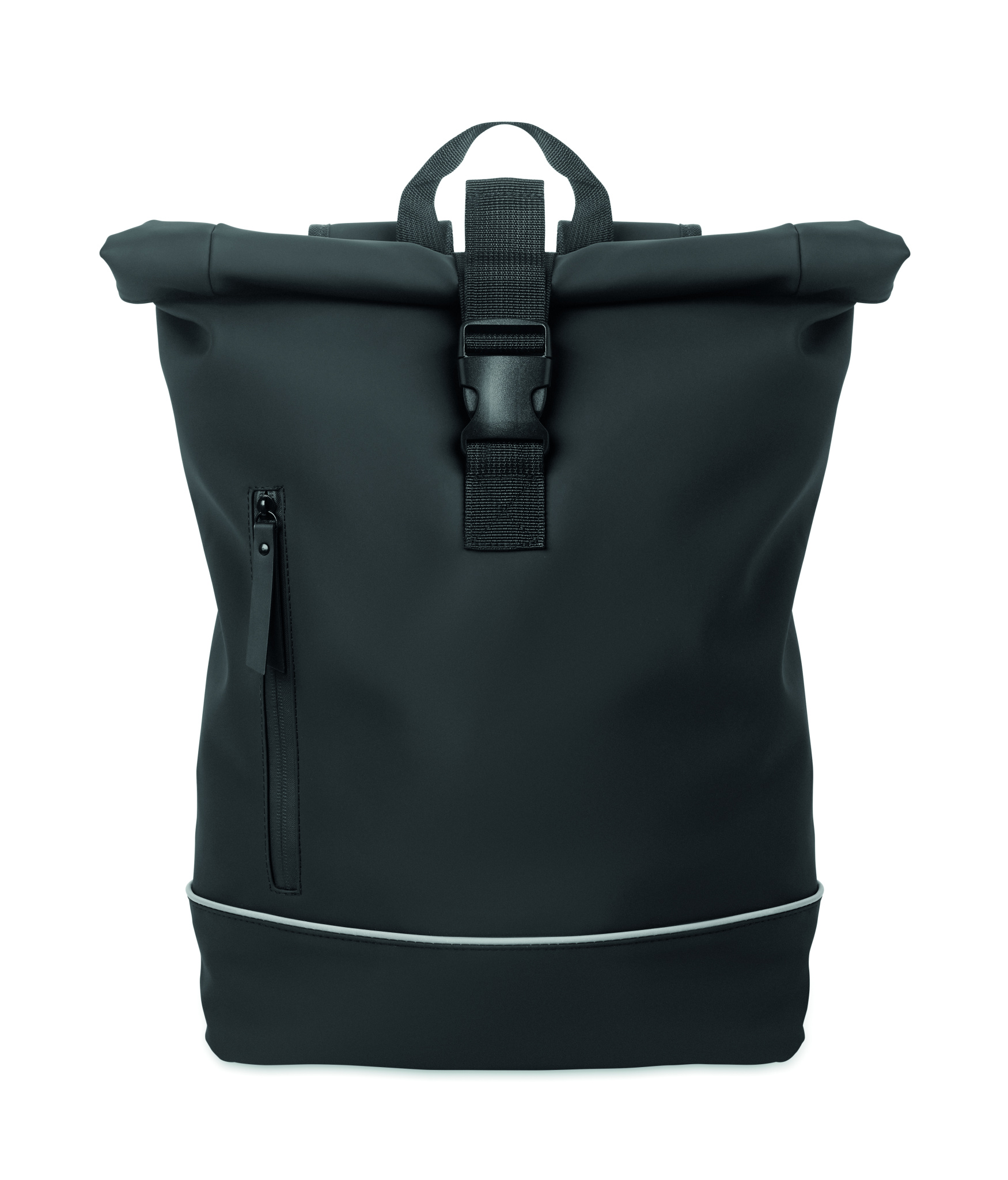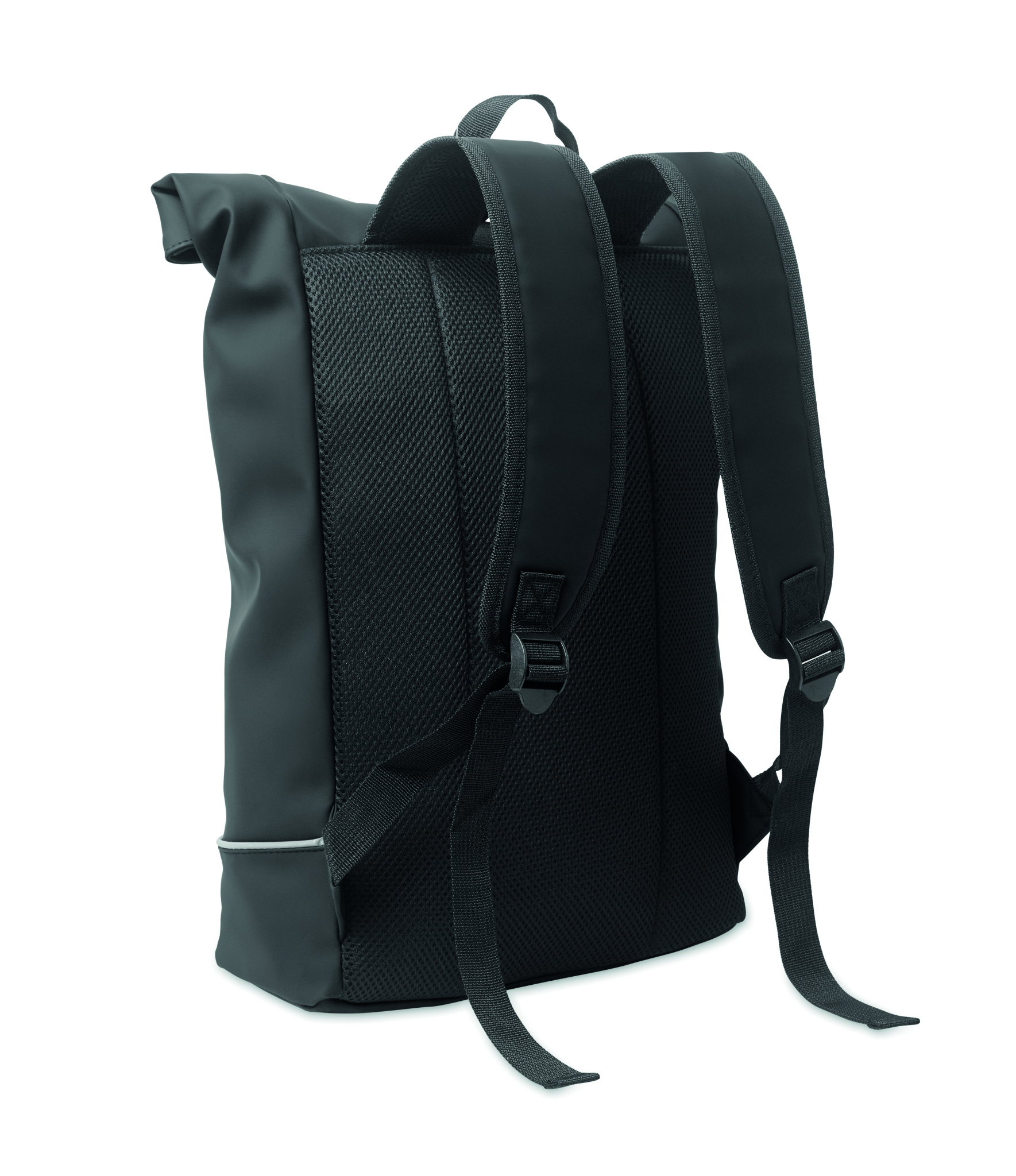 15'' rolltop laptop-ryggsäck i mjuk PU med vadderad rygg och bottenförstärkning med reflexband. Vattentät frontficka med dragkedja. foder i 210D RPET-polyester.