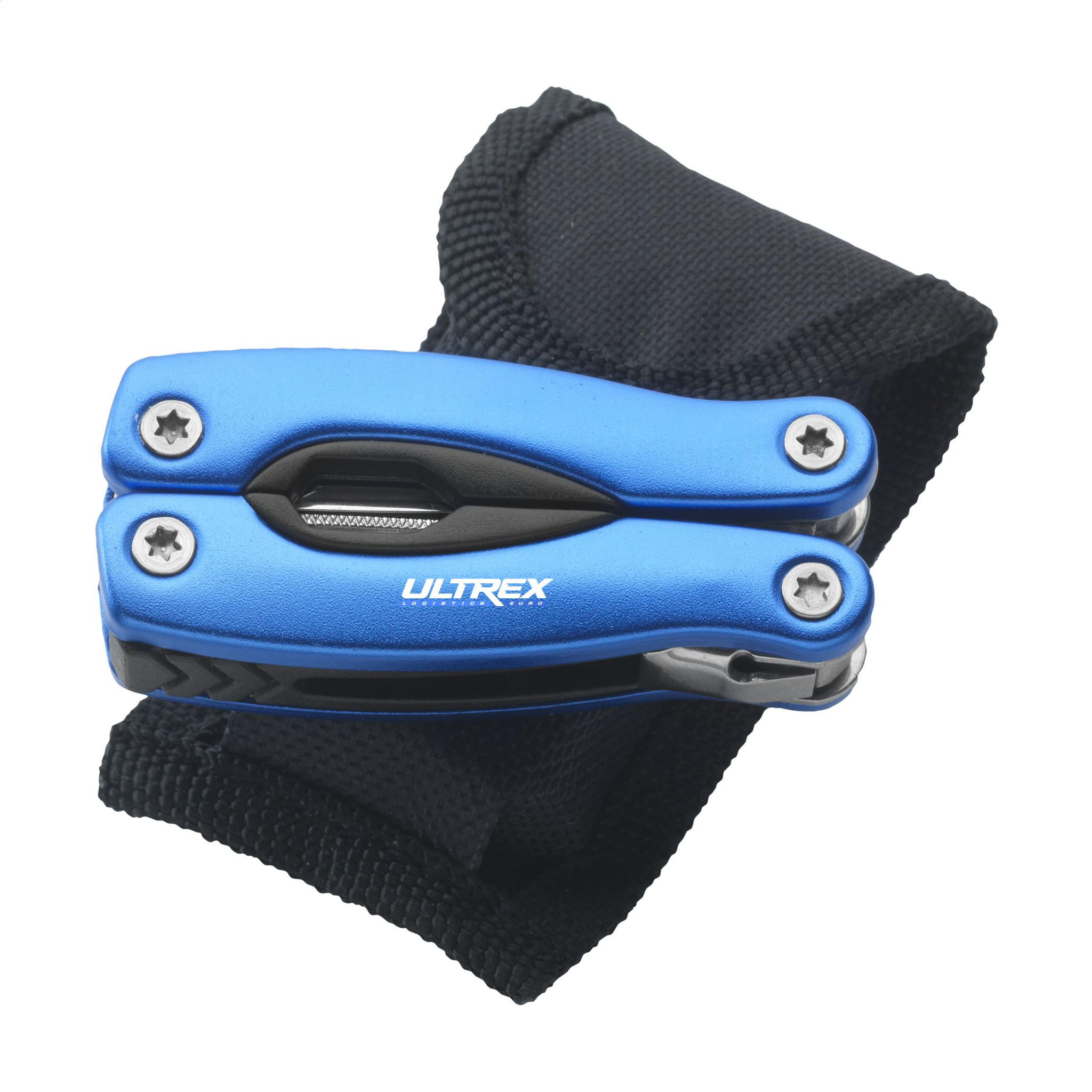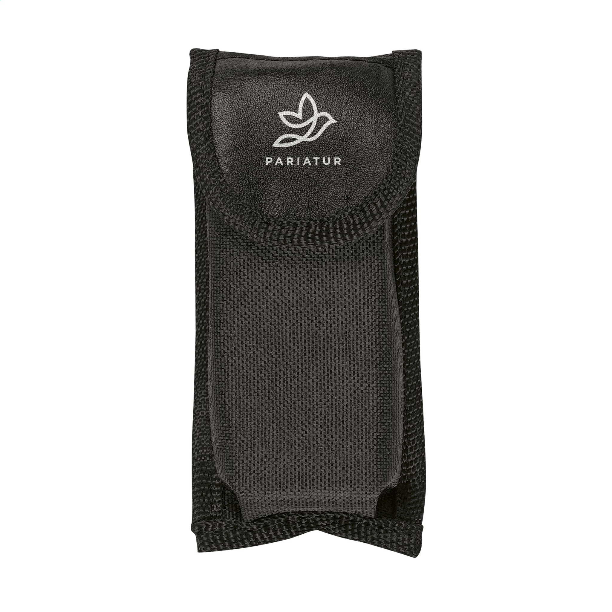 Kompakt multiverktyg i rostfritt stål med handtag i aluminium och metalliskt utseende. 9 delar med 13 funktioner: tång, trådskärare, 3 skruvmejslar, brotsch, fil, konservöppnare, locklyftare, fiskskrapa, krokborttagningsverktyg, kniv och stjärnskruvmejsel. Med lås. I nylonfodral. Observera att lokala regler kan gälla angående innehav och/eller bärande av knivar eller multiverktyg offentligt. Varje artikel levereras i en individuell brun kartong.