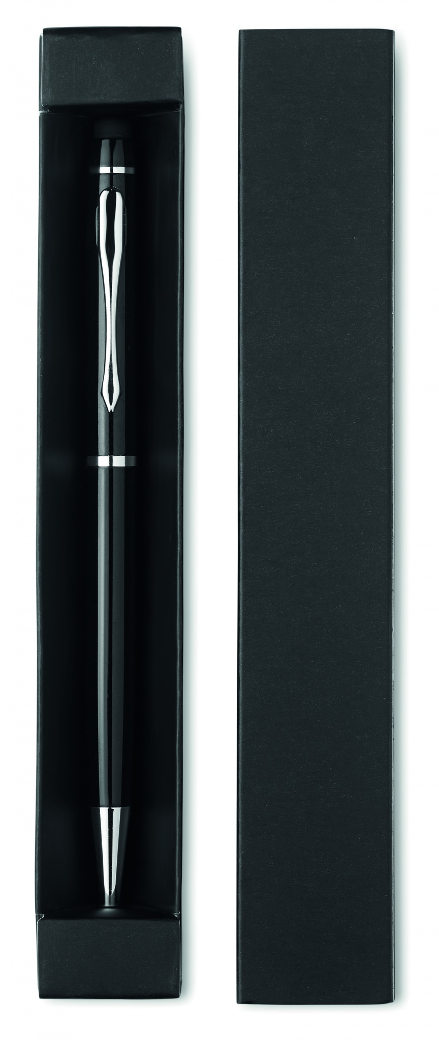 Kulspetspenna i aluminium med touch screen topp. Blått bläck. Presentkartong i papp.