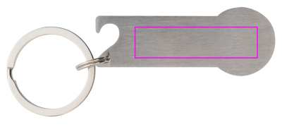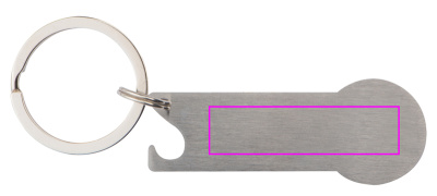 Nyckelring i rostfritt stål med integrerat kundvagnschip, nyckelring och flasköppnare. Din logotyp kommer att laseras på fob.