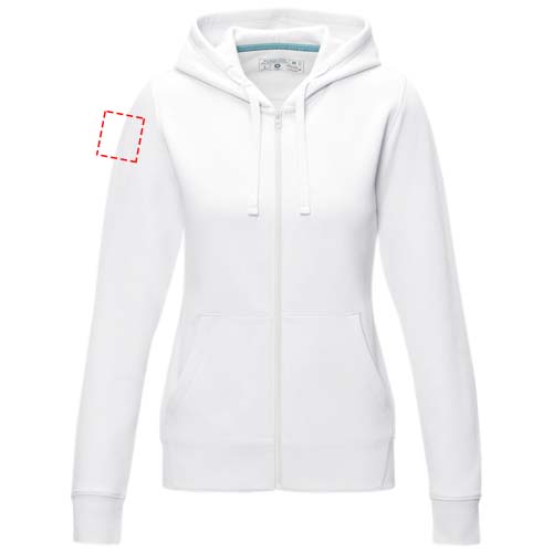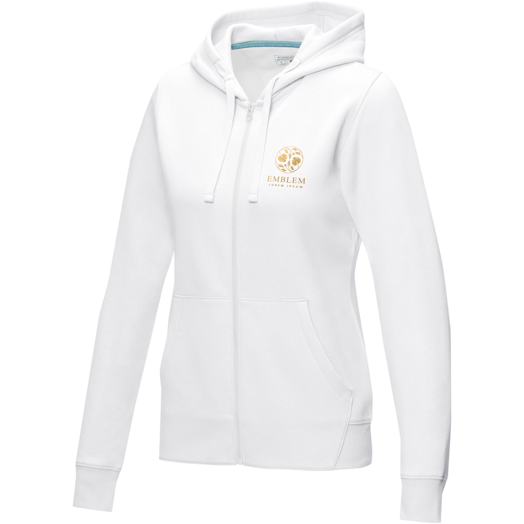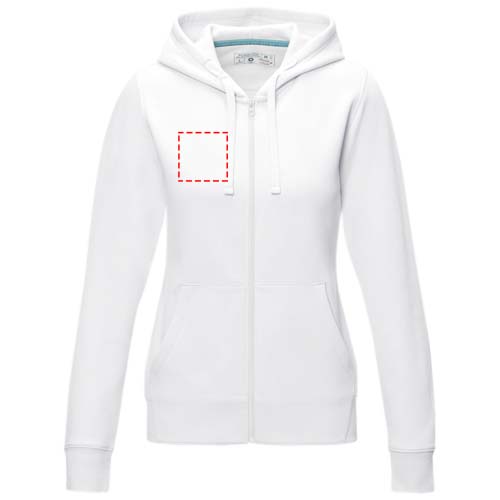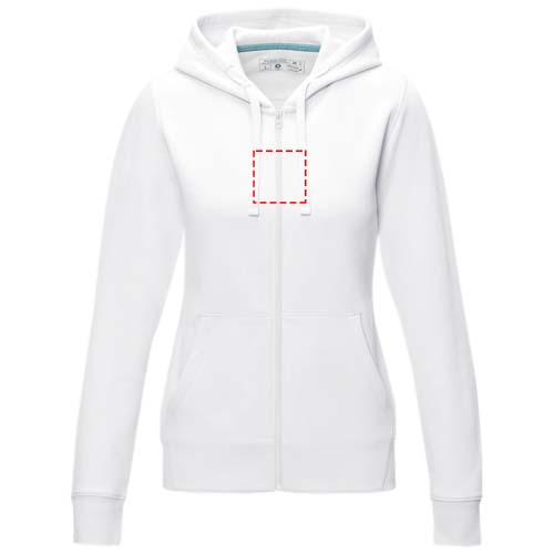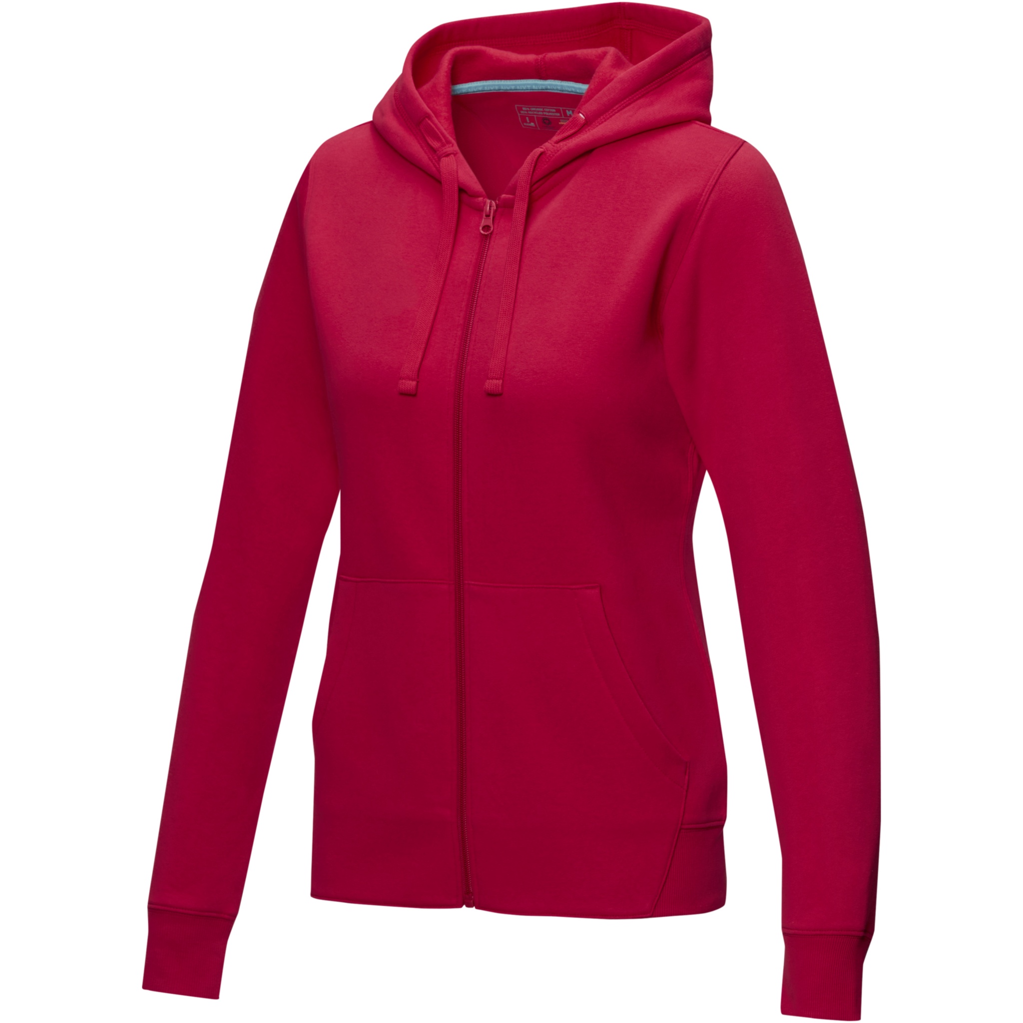 Ruby organic recycled hoodie med hel dragkedja för damer - denna hoodie visar upp en blandning av miljömedvetna egenskaper som omdefinierar modernt mode. Den mjuka borstade insidan ger en skön känsla. Tillverkad av en 280 g/m²-blandning av ekologisk bomull och återvunnen polyester. Huvtröjan har en figurnära passform för en feminin look.