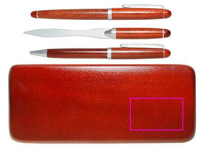 Rosewoodsetet innehåller: en kulpenna av trä med vridmekanism och blåskrivande metallpåfyllning, en reservoarpenna i trä med blåskrivande patron och en brevöppnare. Din logotyp kommer att graveras på lådan.