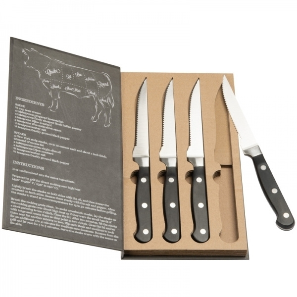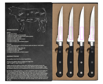 Berättelsen om kött! För den perfekta biffen behöver du de perfekta knivarna, annars ser din stek mer eller mindre ut som malet. Detta stekknivset är tillverkat av rostfritt stål och kvaliteten är bara fantastisk. Packningen kommer att göra setet ännu bättre. Vi kommer att trycka din logotyp på förpackningen.